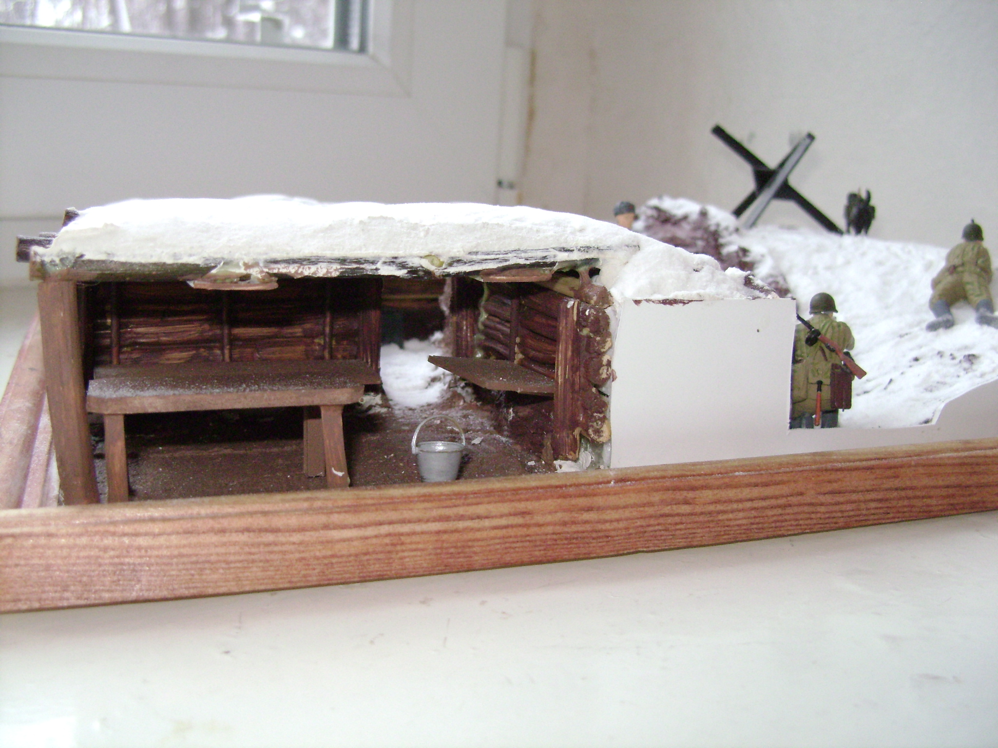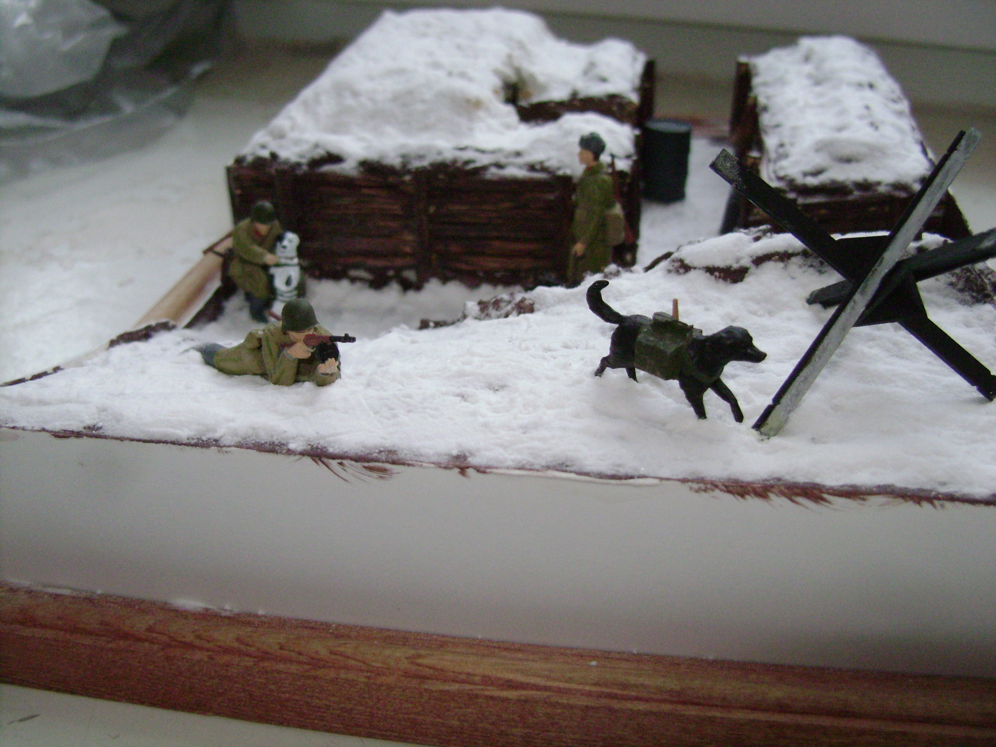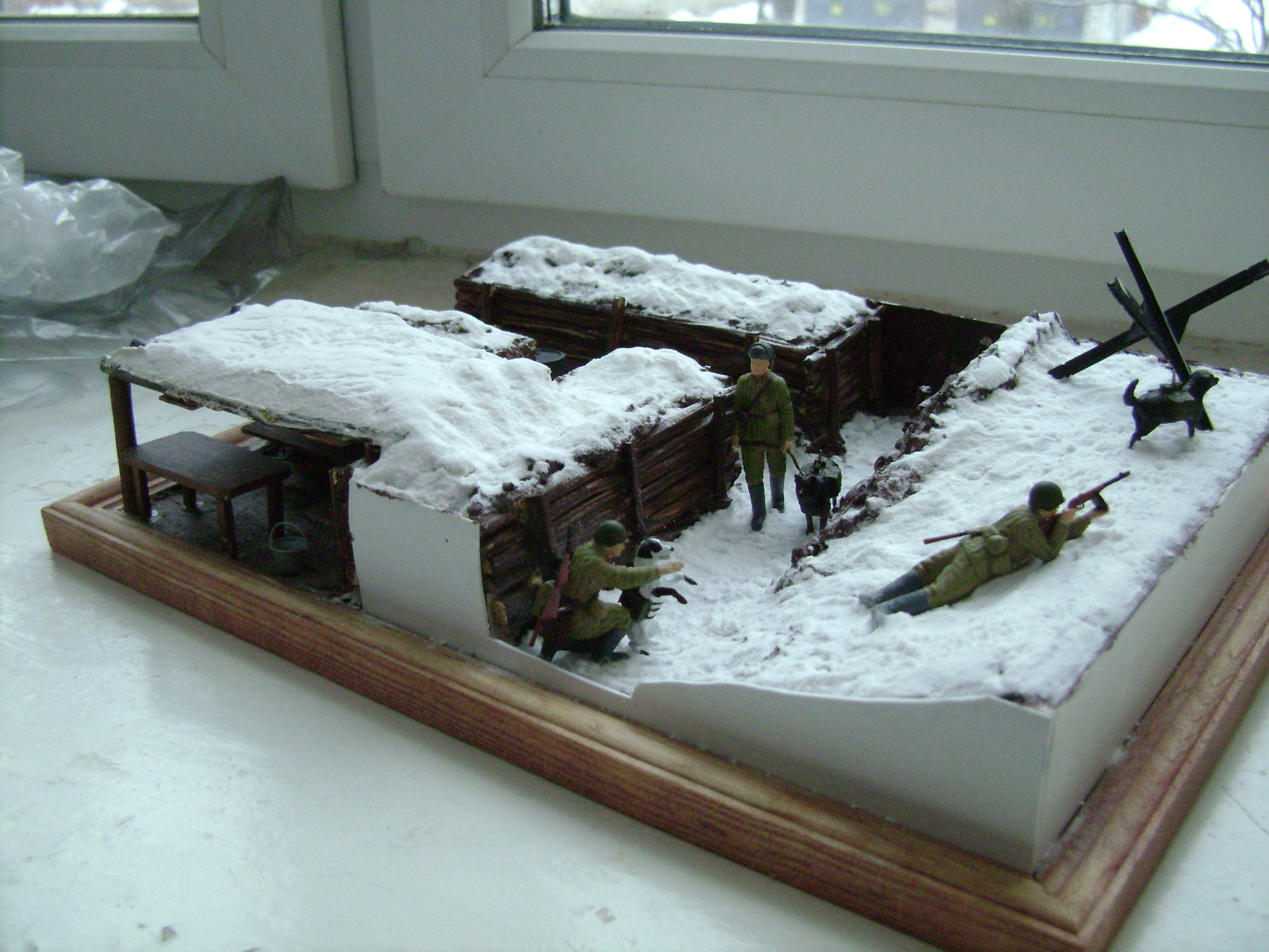 Фигурки Звезда. Краска Звезда. Противотанковый ёж - Master Box. Снег - сода. Стенки окопа (траншея) - прутики веника. Линейки.