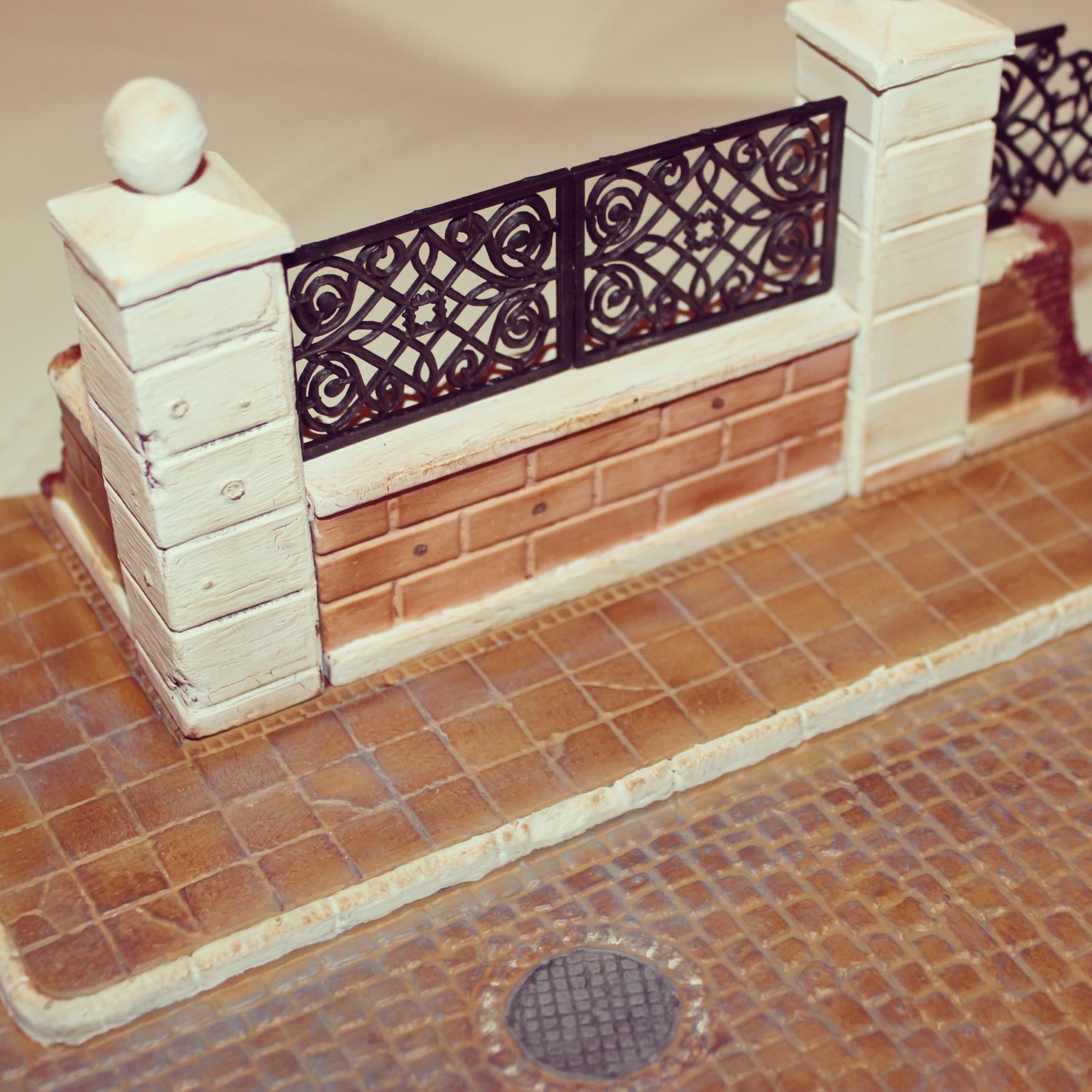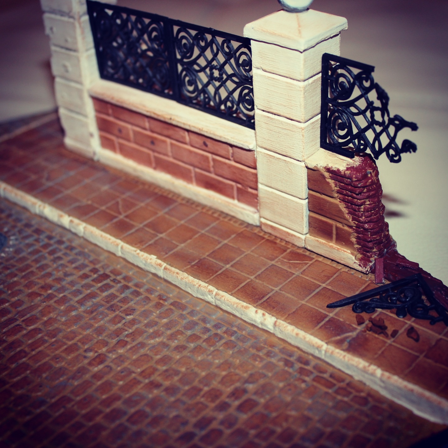 а так неплохо, но 1) почему плитка натёрта красным? 2) сломавшаяся решётка так сломаться не могла. "голова болеть не может. она же кость!" так и решётка же чугун. а он колется...