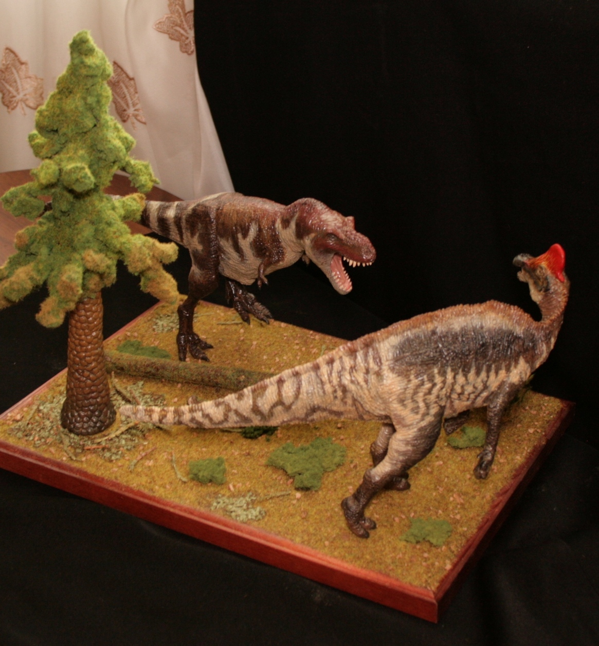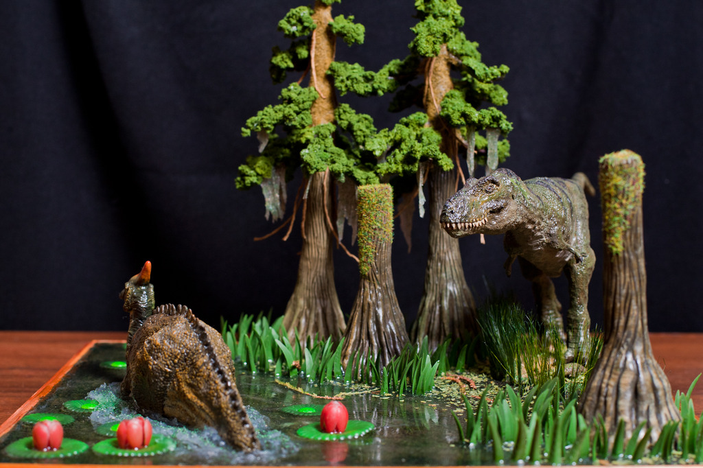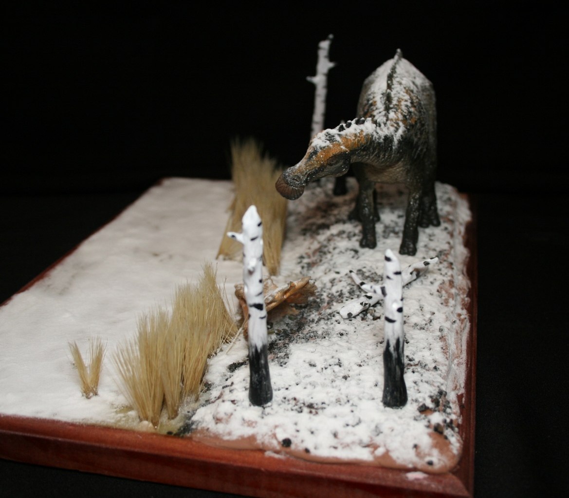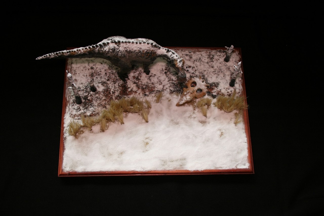 Касательно тираннозавра-его нет ни на первой,ни на второй диорамах.Это близкородственные животные Ти-рексу,входящие с ним в одно семейство.На первой диораме представлен Tarbosaurus efremovi ( голотип ПИН № 551-2) с промерами пропорций из обзорной работы Малеева(1955).Второй Albertosaurus periculosus-сейчас не валидный тираннозаврид из Приамурья описанный по крайнефрагментарному материалу Рябининым в 1932 году.Тут я несколько дал волю фантазии взяв за основу скелетную прорисовку Г.Пола.