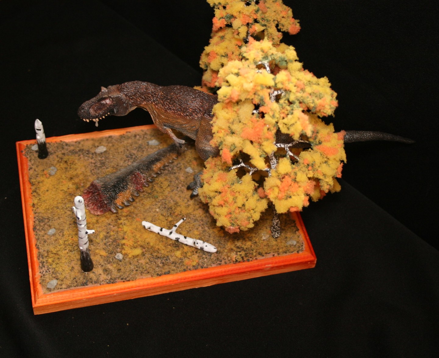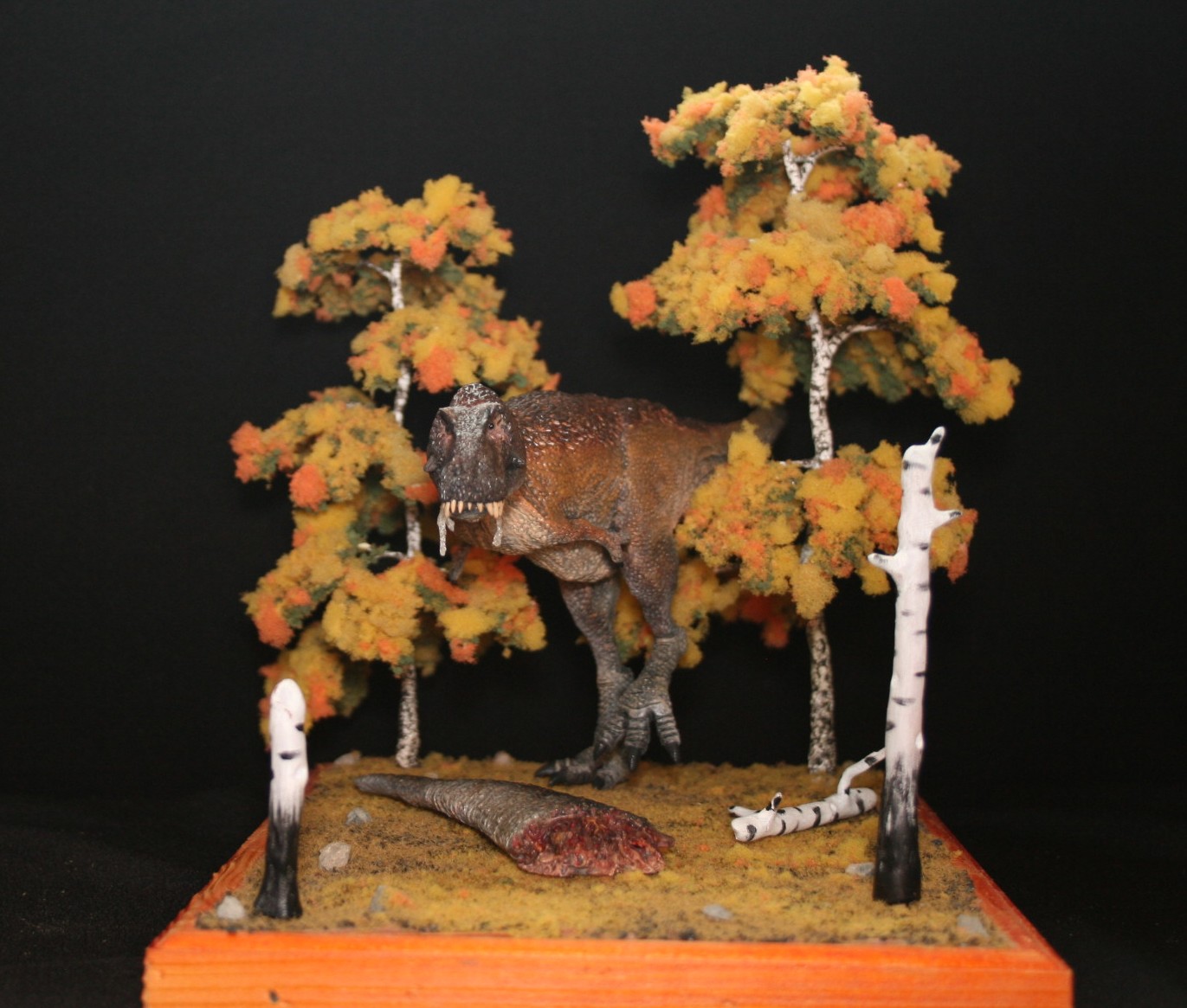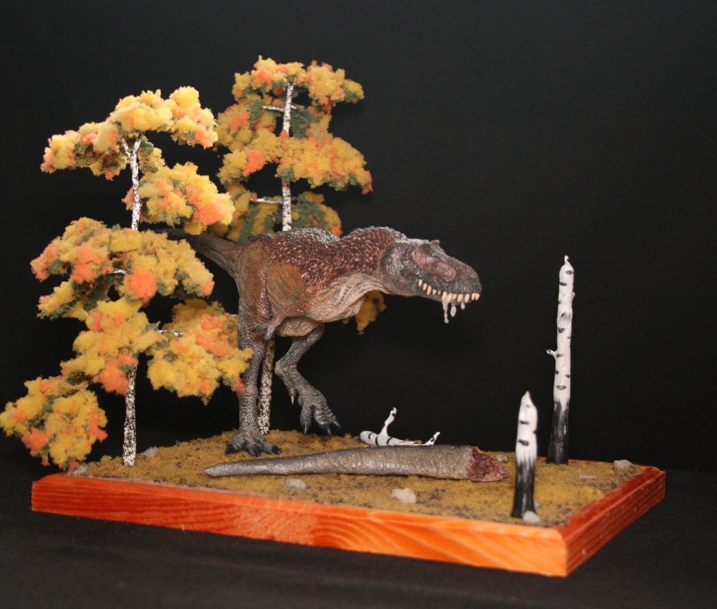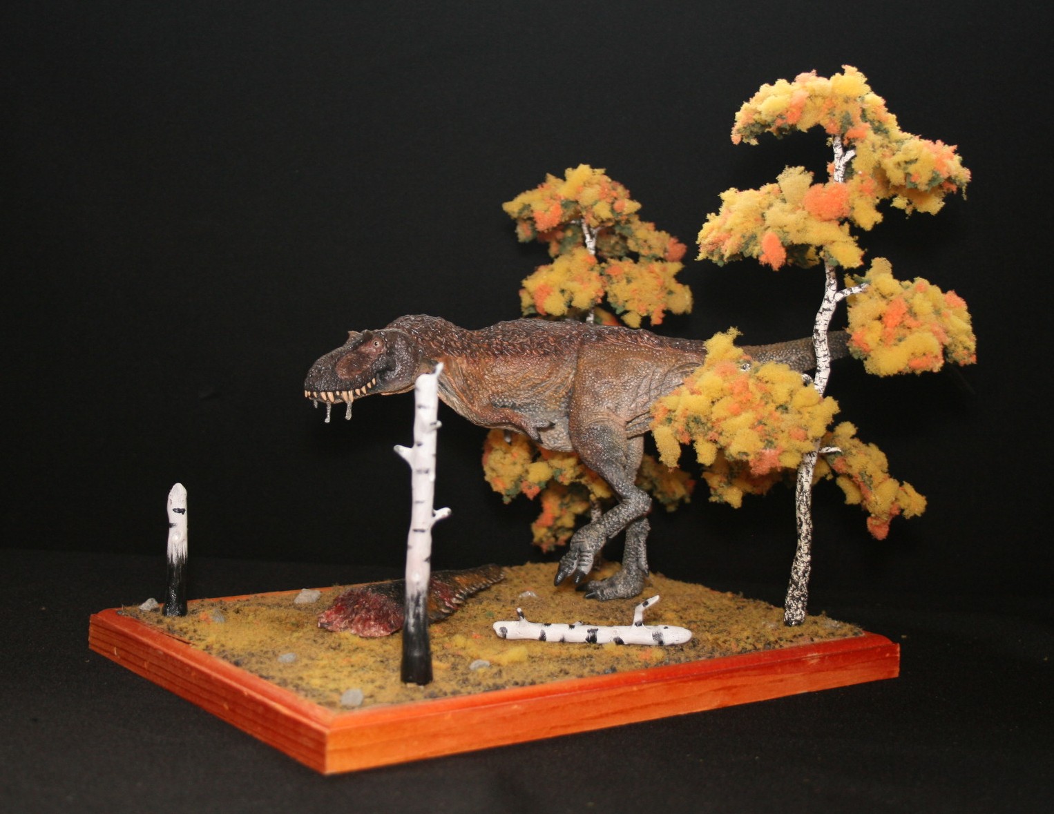 Касательно тираннозавра-его нет ни на первой,ни на второй диорамах.Это близкородственные животные Ти-рексу,входящие с ним в одно семейство.На первой диораме представлен Tarbosaurus efremovi ( голотип ПИН № 551-2) с промерами пропорций из обзорной работы Малеева(1955).Второй Albertosaurus periculosus-сейчас не валидный тираннозаврид из Приамурья описанный по крайнефрагментарному материалу Рябининым в 1932 году.Тут я несколько дал волю фантазии взяв за основу скелетную прорисовку Г.Пола.