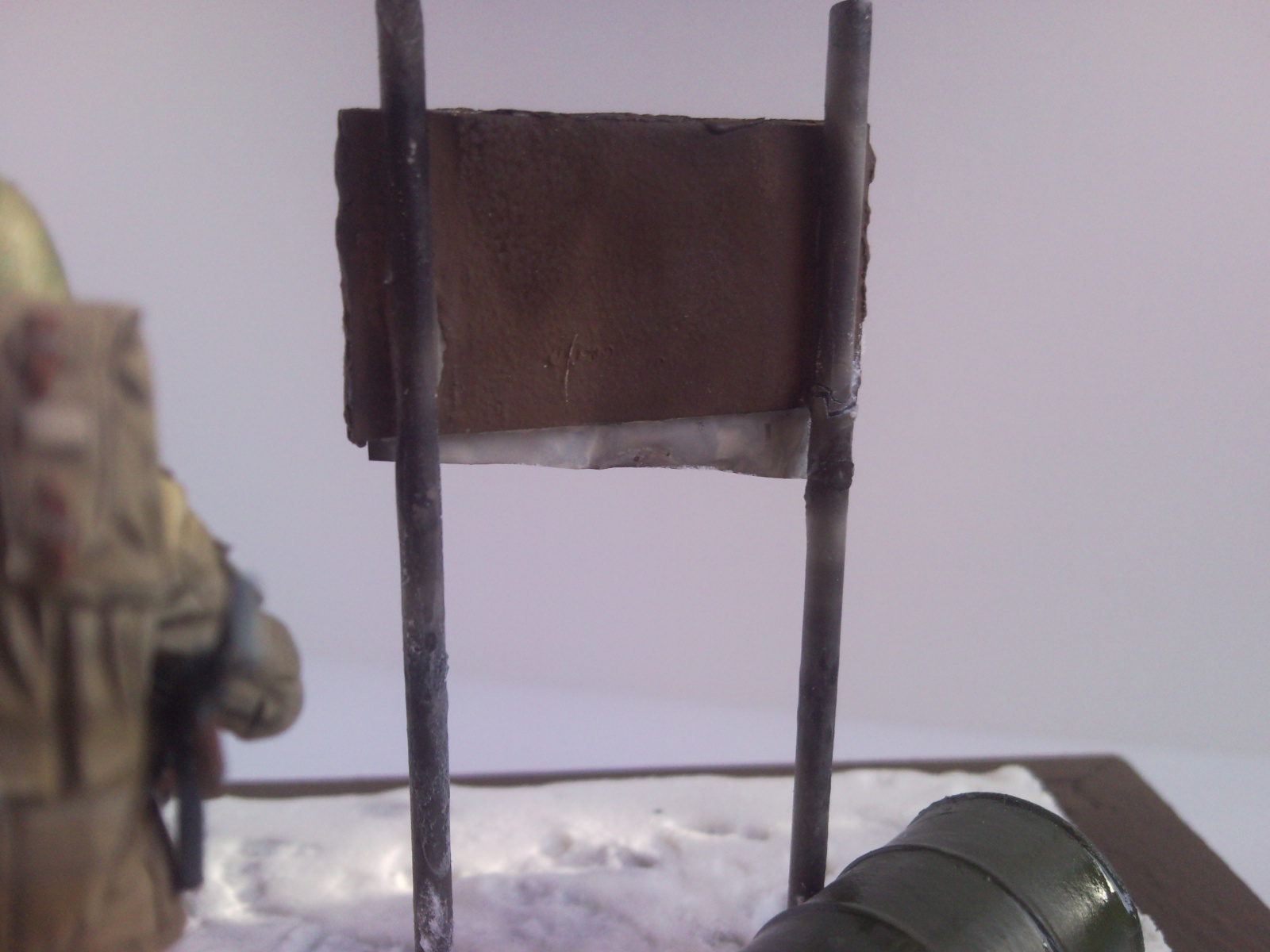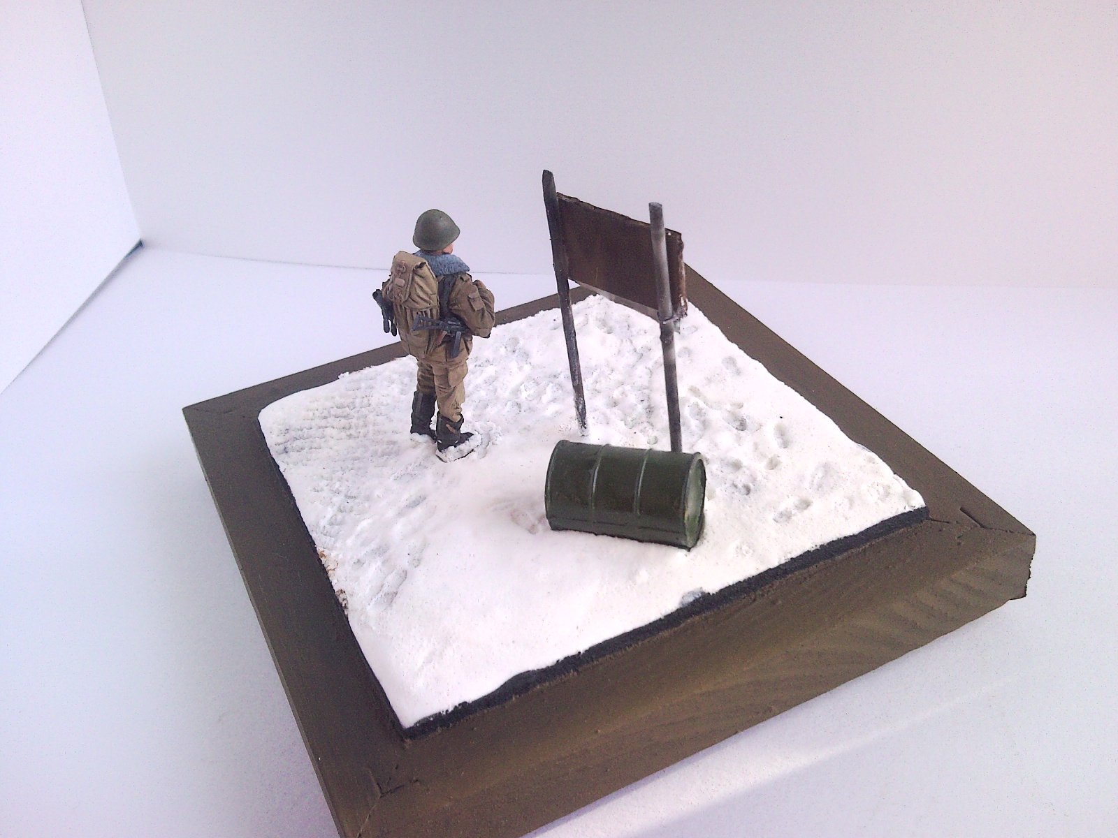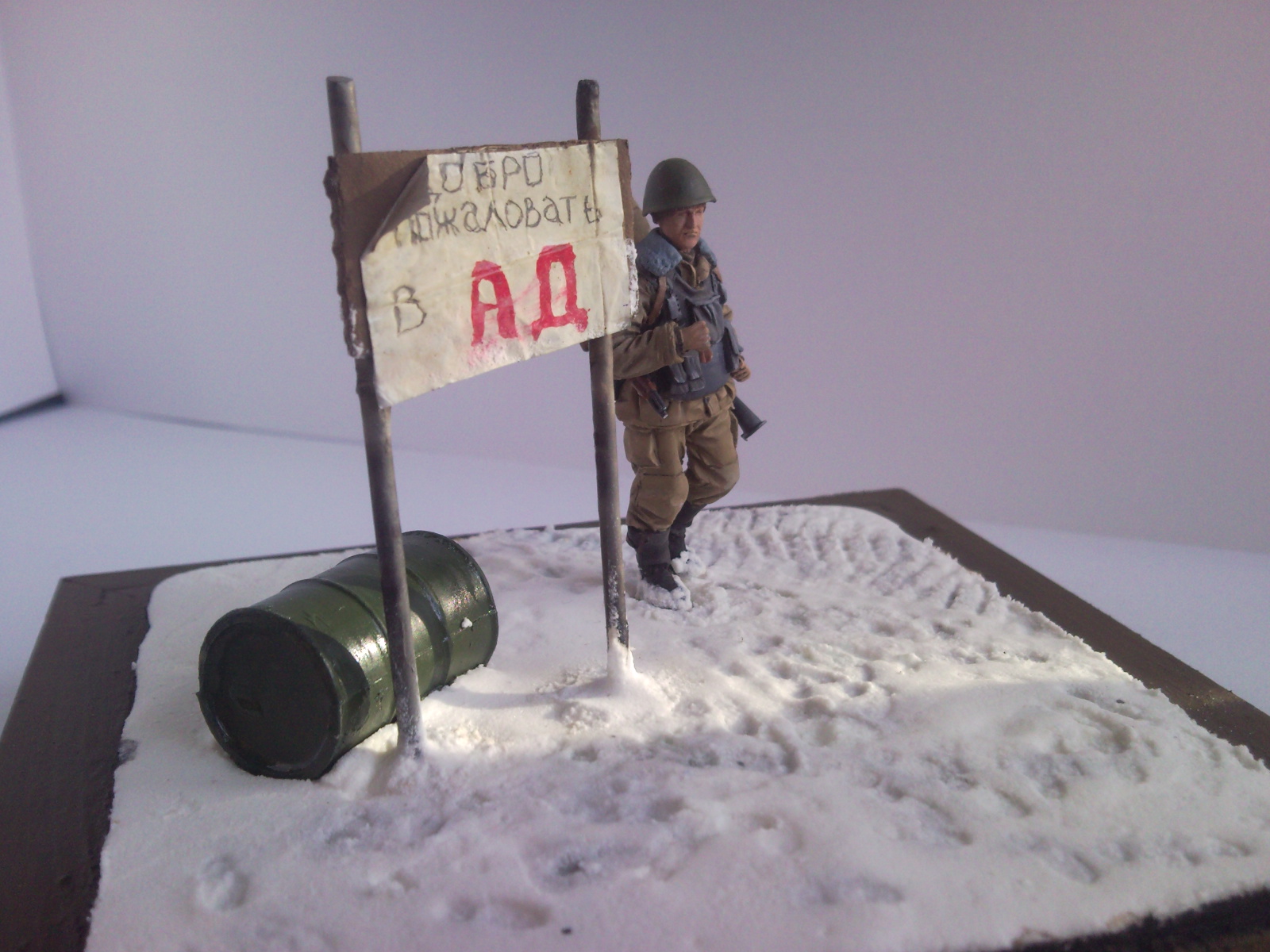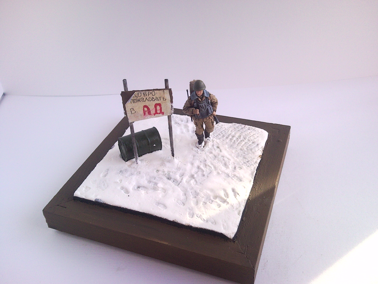 Неплохая работа, понравилось. Даже относительно "пустое" основание и чистый снег играют в её пользу, вроде как за табличкой будут и грязь и развалины... Вот только солдат, получается, идёт ИЗ "ада". Лучше бы его развернуть чтоб шёл ТУДА.