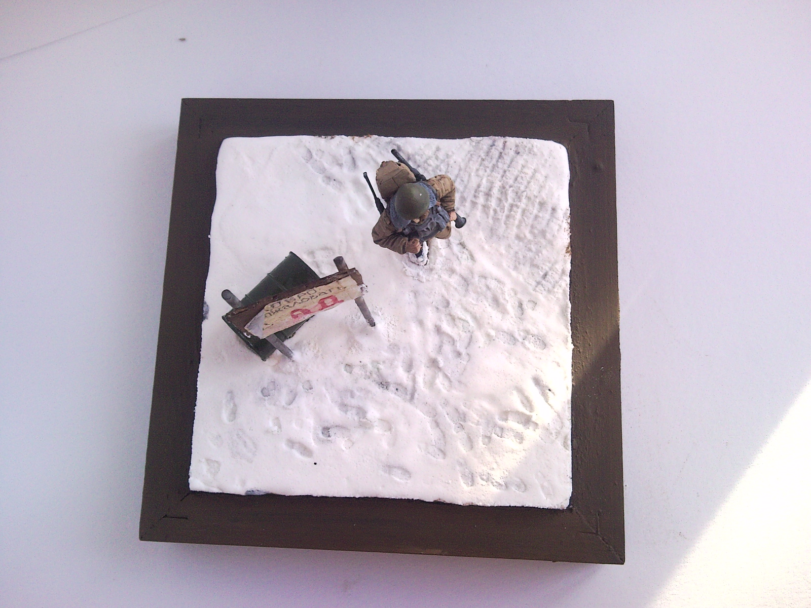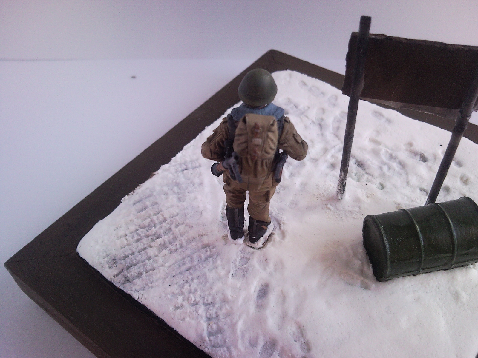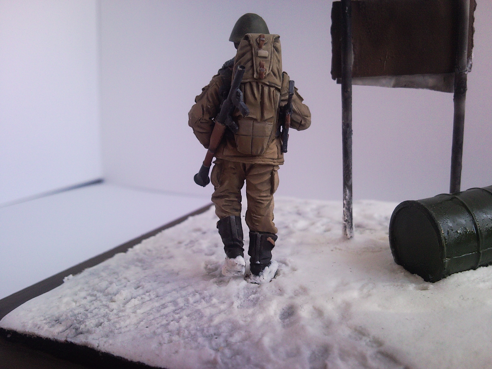 Неплохая работа, понравилось. Даже относительно "пустое" основание и чистый снег играют в её пользу, вроде как за табличкой будут и грязь и развалины... Вот только солдат, получается, идёт ИЗ "ада". Лучше бы его развернуть чтоб шёл ТУДА.