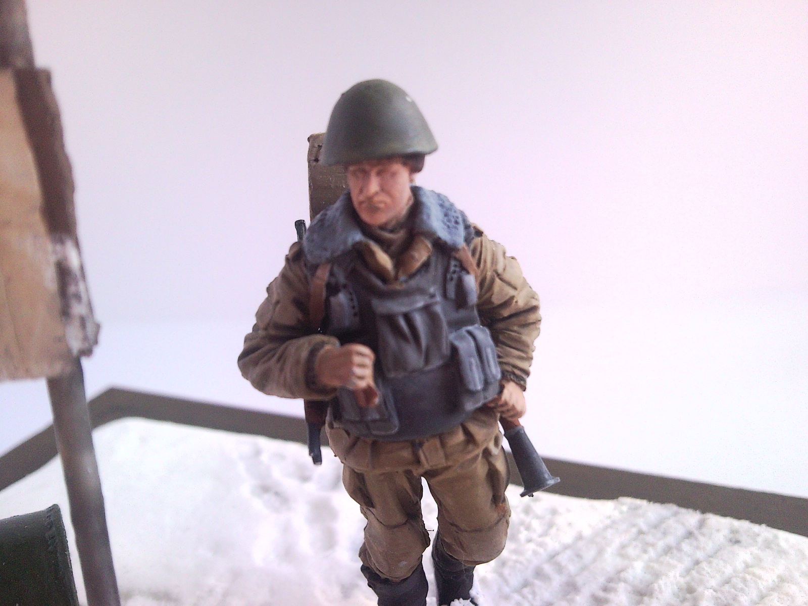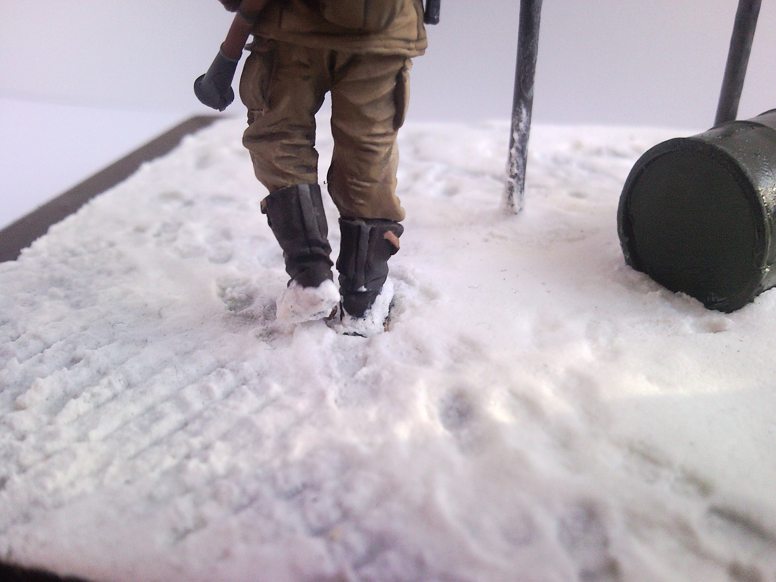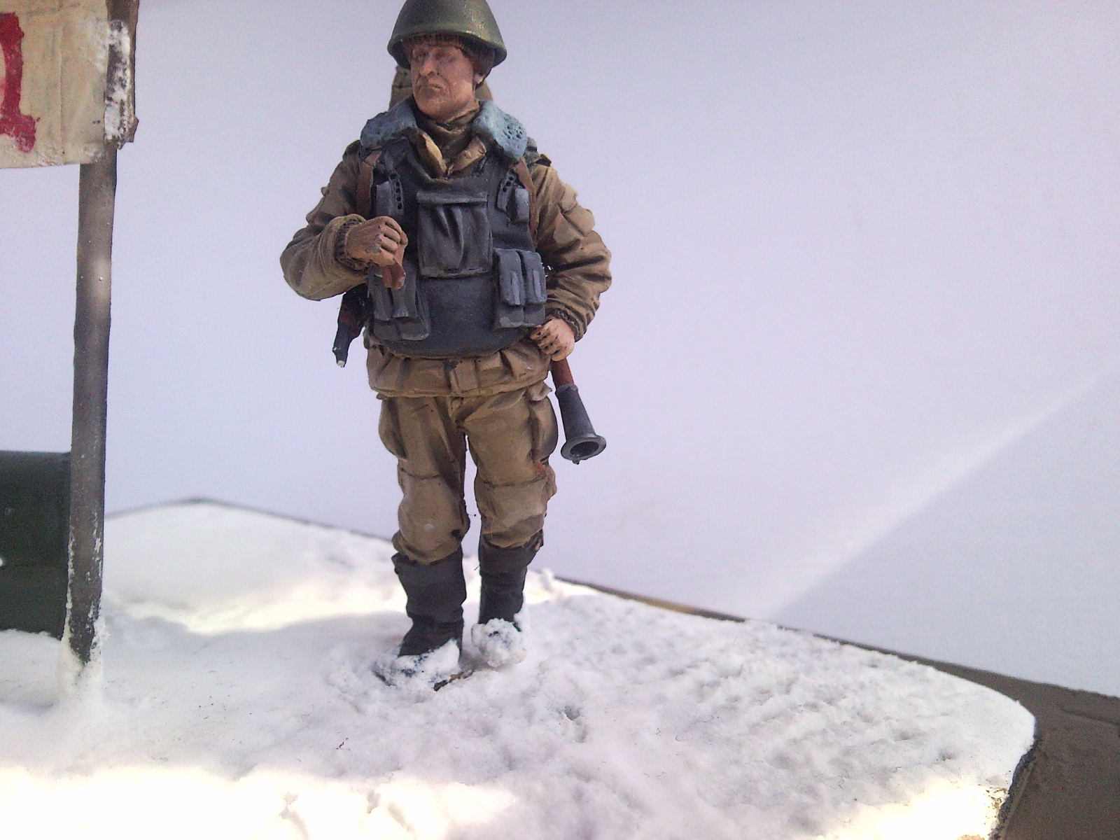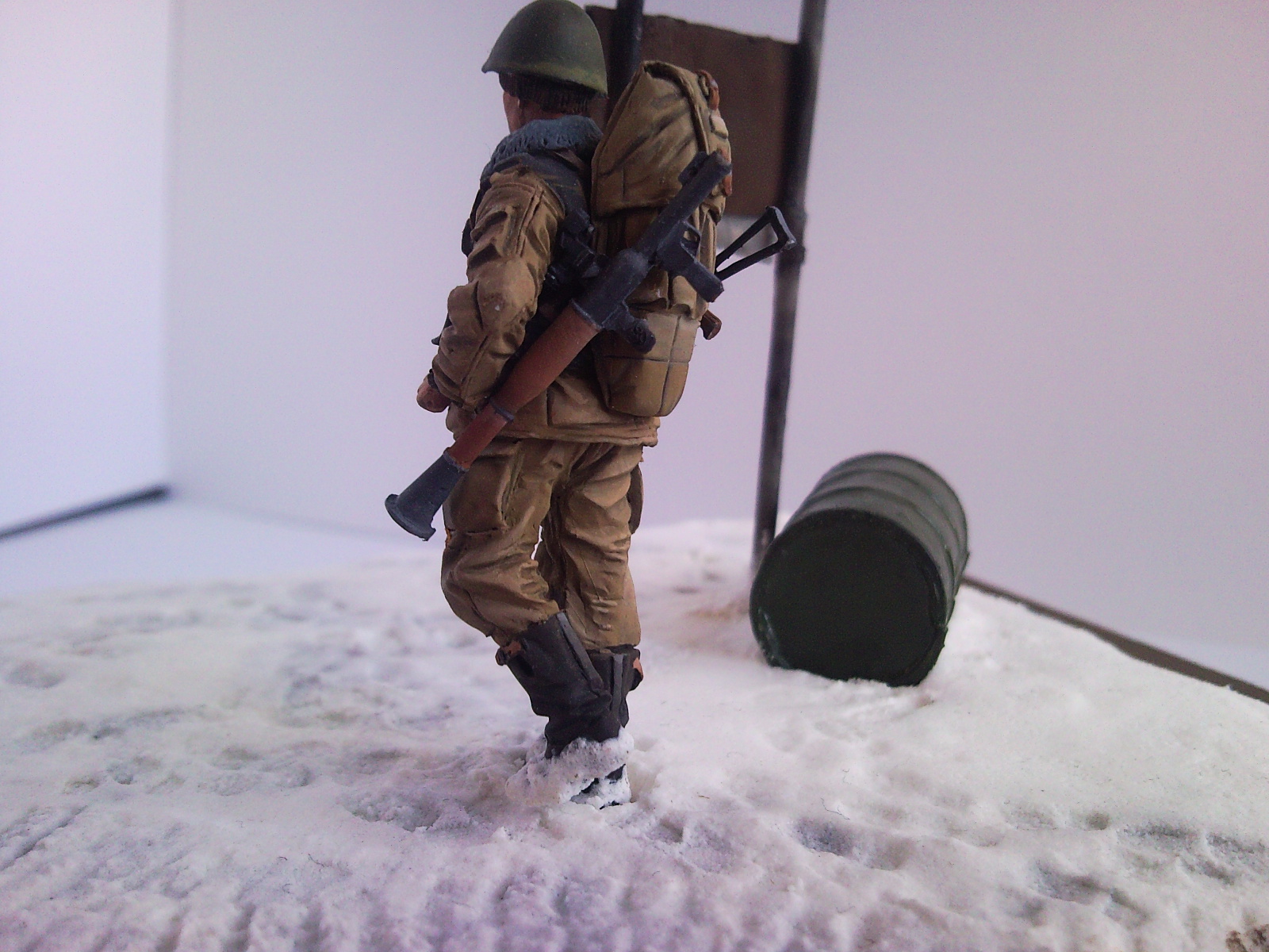 Неплохая работа, понравилось. Даже относительно "пустое" основание и чистый снег играют в её пользу, вроде как за табличкой будут и грязь и развалины... Вот только солдат, получается, идёт ИЗ "ада". Лучше бы его развернуть чтоб шёл ТУДА.