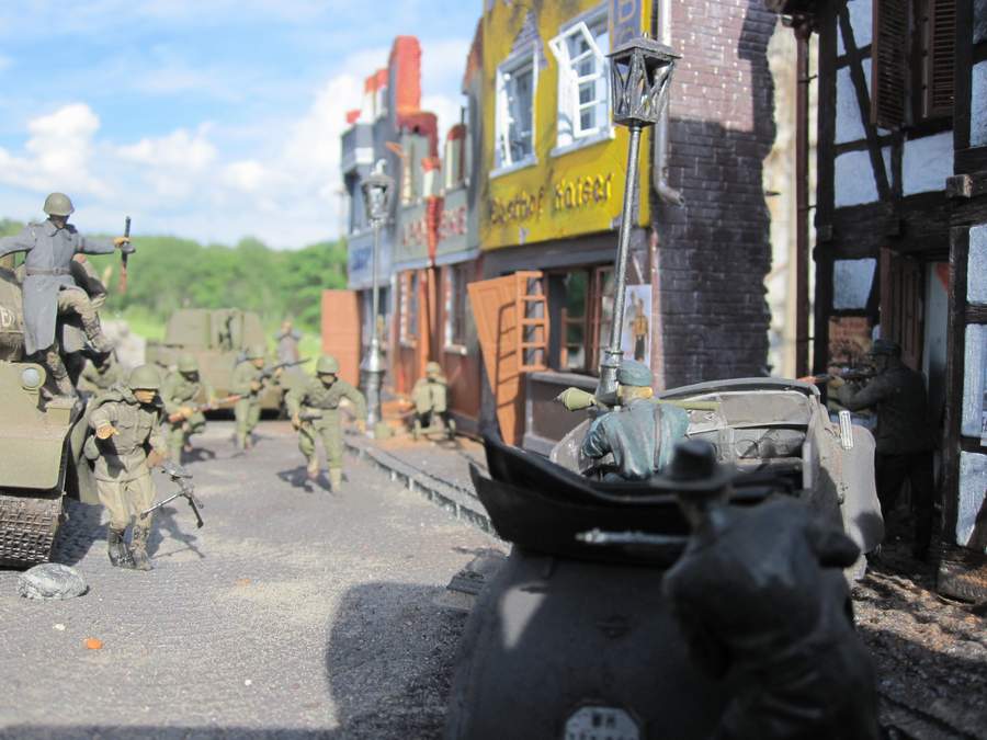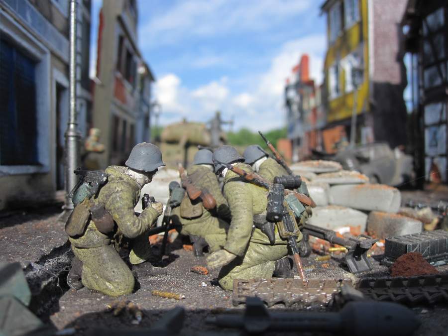 ученик, за масштабность работы 5+. А по деталям - очень хромает сюжет и исполнение. За качество покраски говорить не будем, в конце концов на такой диораме тщательно прописывать каждую фигуру - адский труд. Но с техникой стоило больше повозиться, придать ей поношенный вид. Далее: квартал весь в руинах, но очень мало мусора для таких расзушений - улица частая. У Штуга катки и гусеницы не стоят на основании плотно, а висят в воздухе (предпоследнее фото), стоило, наверное, во время сборки модели пригнать ходовую к основанию более тщательно. Подбитая гусеница так с ведущего колеса не упадёт, изогнуть можно было бы. Советские солдаты прям так и бегут грудью под пули. Наверное, стоило взять другой набор и фигурки расположить около зданий, или за танками. Кстати, вторая Т-34, наверное, прострелит зад впереди идущей - целится точно в корму. Фонарные столбы не погнутся, они просто сломаются, если их протаранит танк. Ну, вкратце всё, удачи в новых работах)