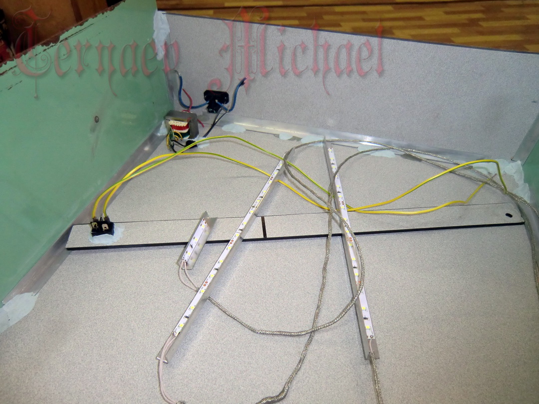 Т.к. диорама низкая и должна была быть "утоплена" в глубокой нише, необходимо было предусмотреть подсветку. Для этого использовал светодиодную ленту "Arlight" RT2-5000 White и старенький БП-12V.