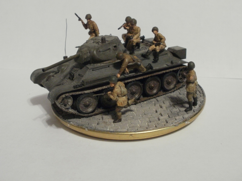 На мой взгляд фигурка бойца лишняя. Вроде и не противоречит по композиции, но какой-то он тут чужой. Танк на основании самодостаточен.