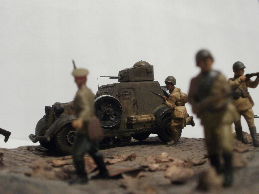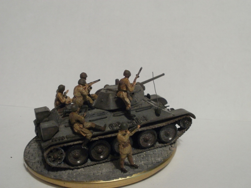 Если судить по позе бойца стоящего справа от танка и по командиру, то машина стоит. Тогда получается что десант готовится покинуть машину и командир должен стоять лицом к ним, указывая куда бежать. А тогда боец бегущий в штыковую либо лишний, либо должен находится позади всех. А то что происходит за пределами виньетки мы, зрители, не видим и Вашего замысла не знаем, поэтому фигуры должны взаимодействовать только между собой. Вот как на Вашей работе с СУ-85: ясно, понятно, никаких вопросов ( разве что к качеству фоток). И здесь: если бы не эти двое слева - была бы первоклассная виньетка. Вообще привлекла, я бы сказал - очаровала, именно компактность виньетки; у самого есть тридцатьчетвёрка, задумался над чем-нибудь подобным.