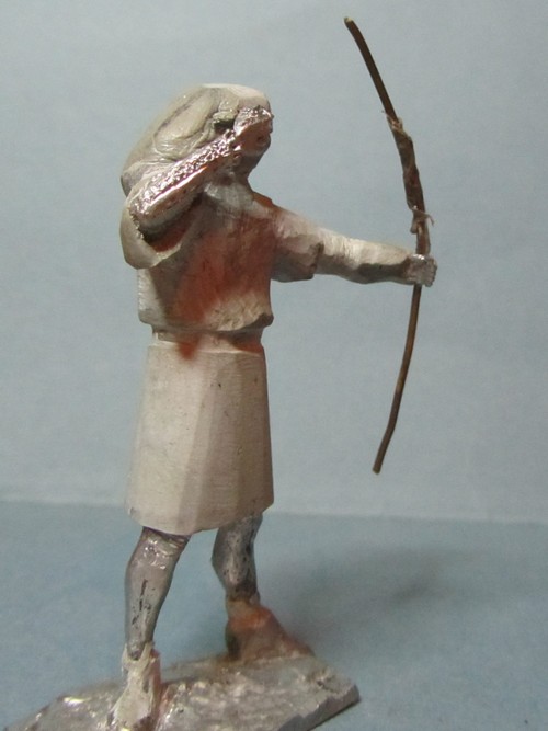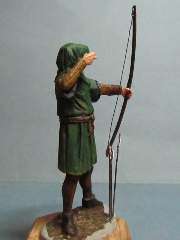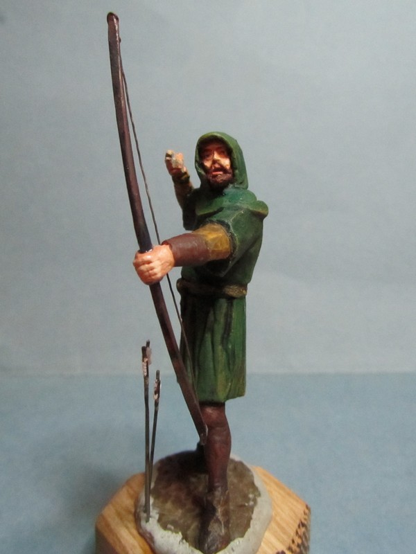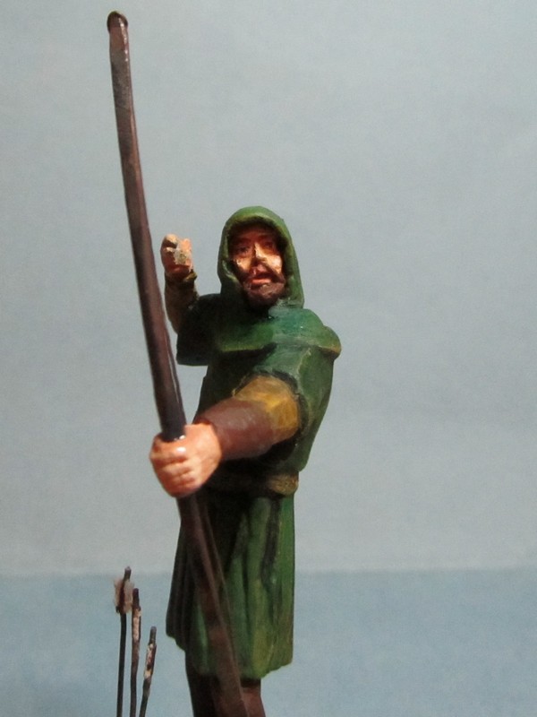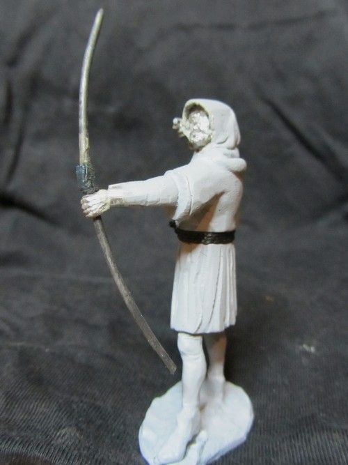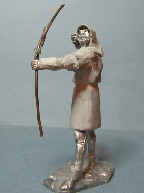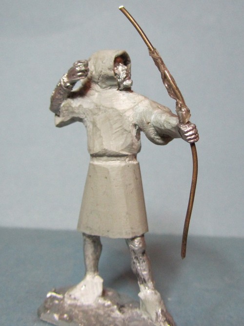 Интересная задумка! Пока трудно сказать за всю фигуру, но вот капюшон надо переделать: во-первых он очень велик сзади, а во-вторых возле шеи он не должен так плотно облегать голову, скорее "раздаться" в стороны. И ещё попробуйте ему распрямить пальцы на правой руке: стрелу-то он отпустил.