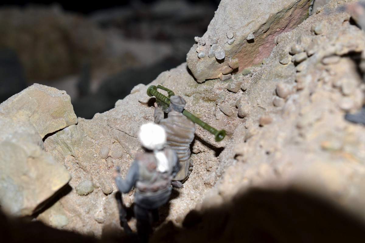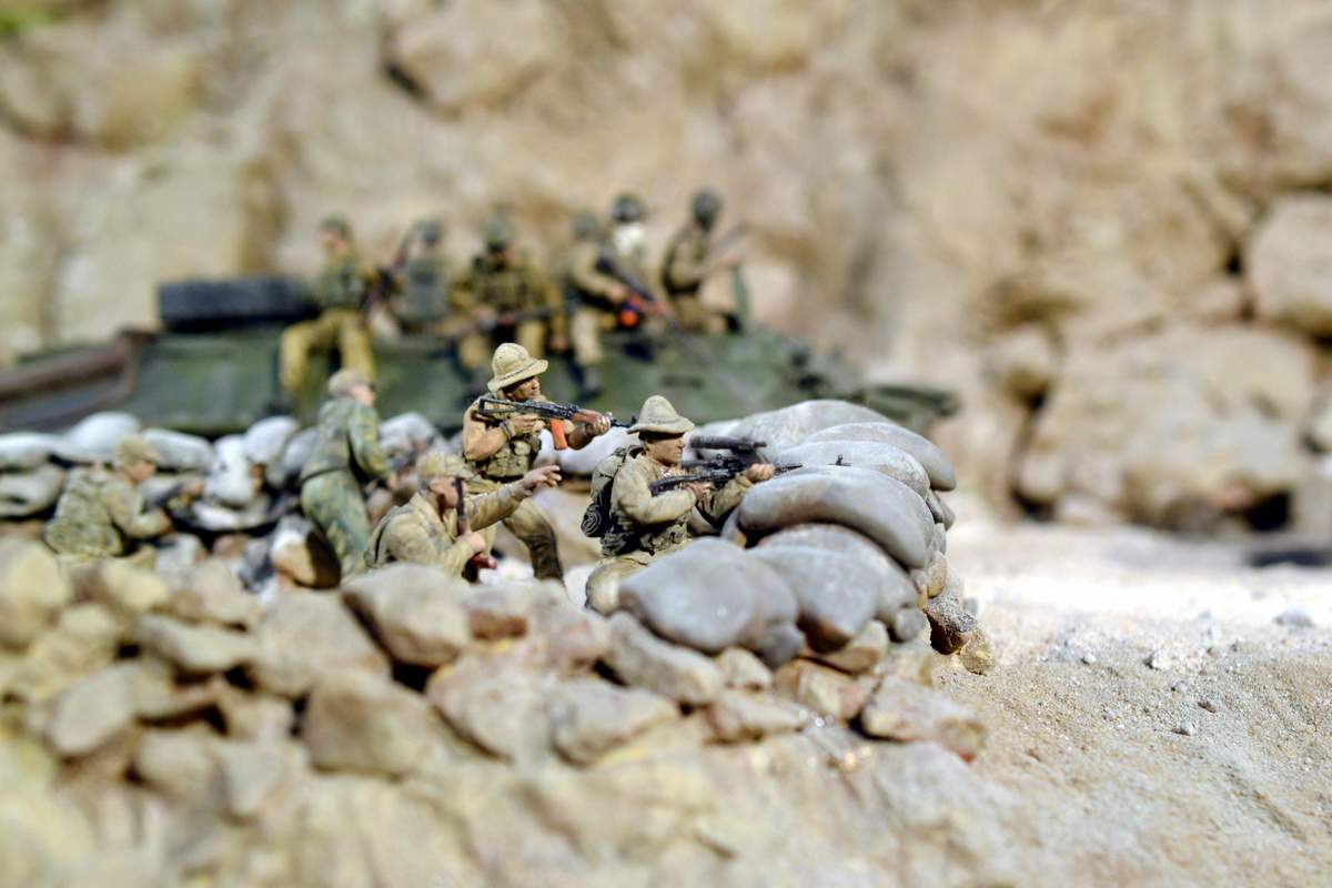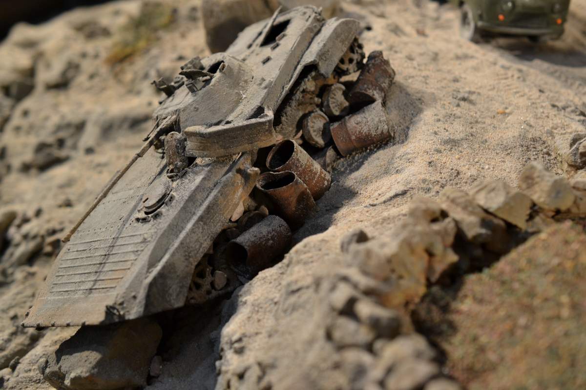 Масштаб 1/35. Практически все модели TRUMPETER, «буханка» - minimanfactory, БМД – СКИФ, БТР-70 – ЗВЕЗДА. Десант и моджахеды masterclub, ANT miniarures, СМК, 5,45. Всё, включая горный массив, покрашено красками TAMIYA. Тонировки использовал MIG и самодельные. Горный массив изготовлен из монтажной пены, обклеенный бумагой на ПВА, плюс добавлены натуральные камни самой разной величины и фактуры. Цвет афганских гор, насколько смог достать из памяти, красно-беж-серо-коричневый (вот такое мудрёное слово). Собственно такие тонировки и использовал при создании макета. Вертолёт закреплён на подставке, сделанной из трёх металлических прутков и покрашенных в чёрный цвет. Самое трудное, как ни странно, было сделать вертолёт. Ни поставить, в одной руке запылишься держать, а всё так хрупко. Сгоревшая БМП сделана из раритетной модели ЗВЕЗДА 1999 года выпуска. Пластик просто супер, аж звенит, хрупкость просто необыкновенная. Фотографий очень много, поэтому буду выкладывать постепенно, начиная с общего плана.