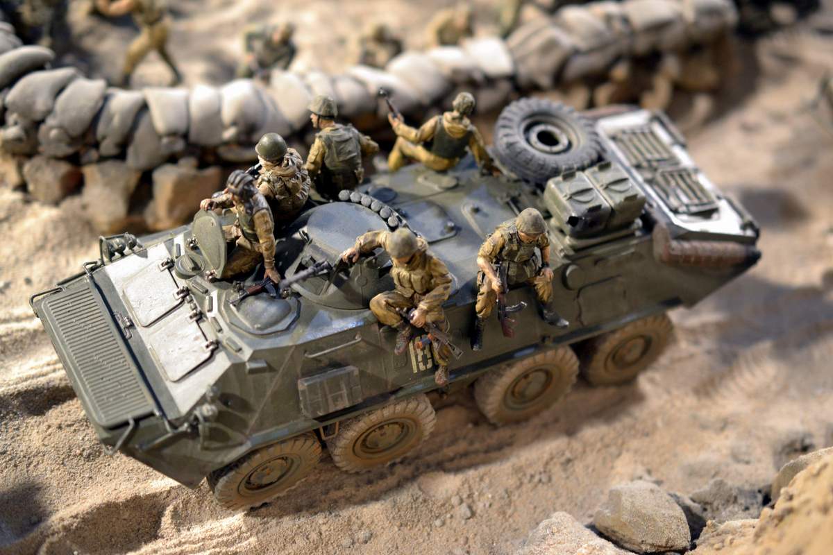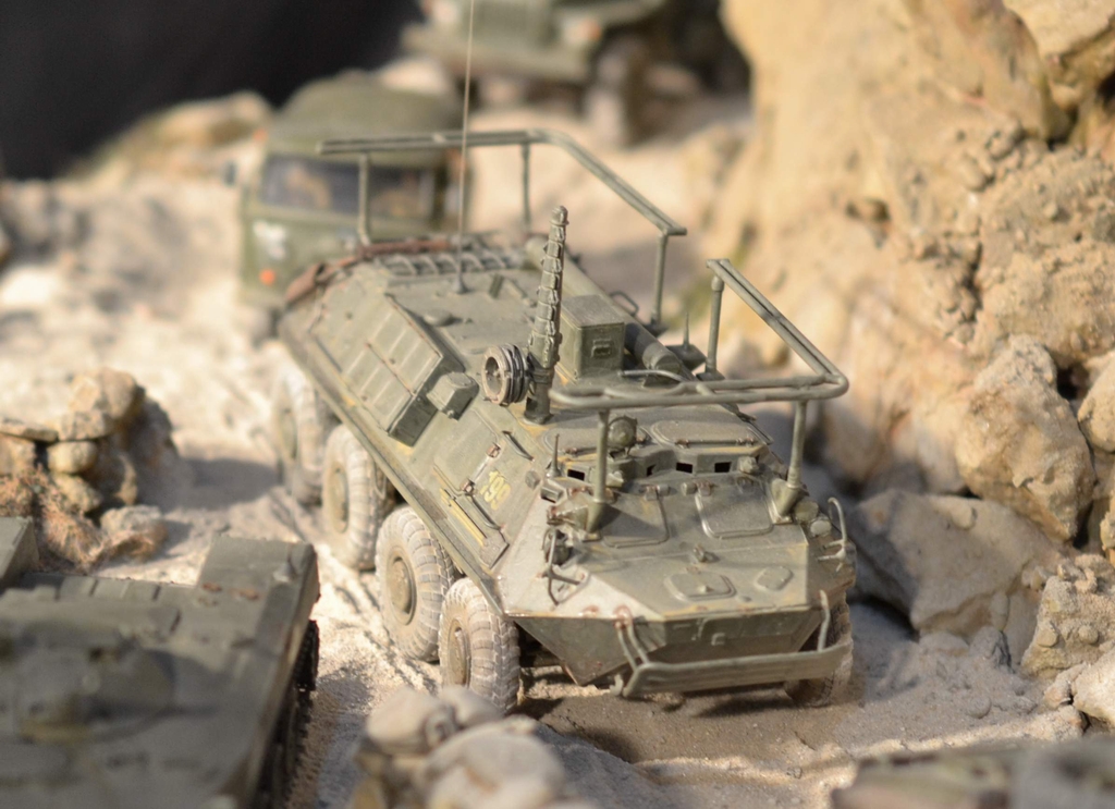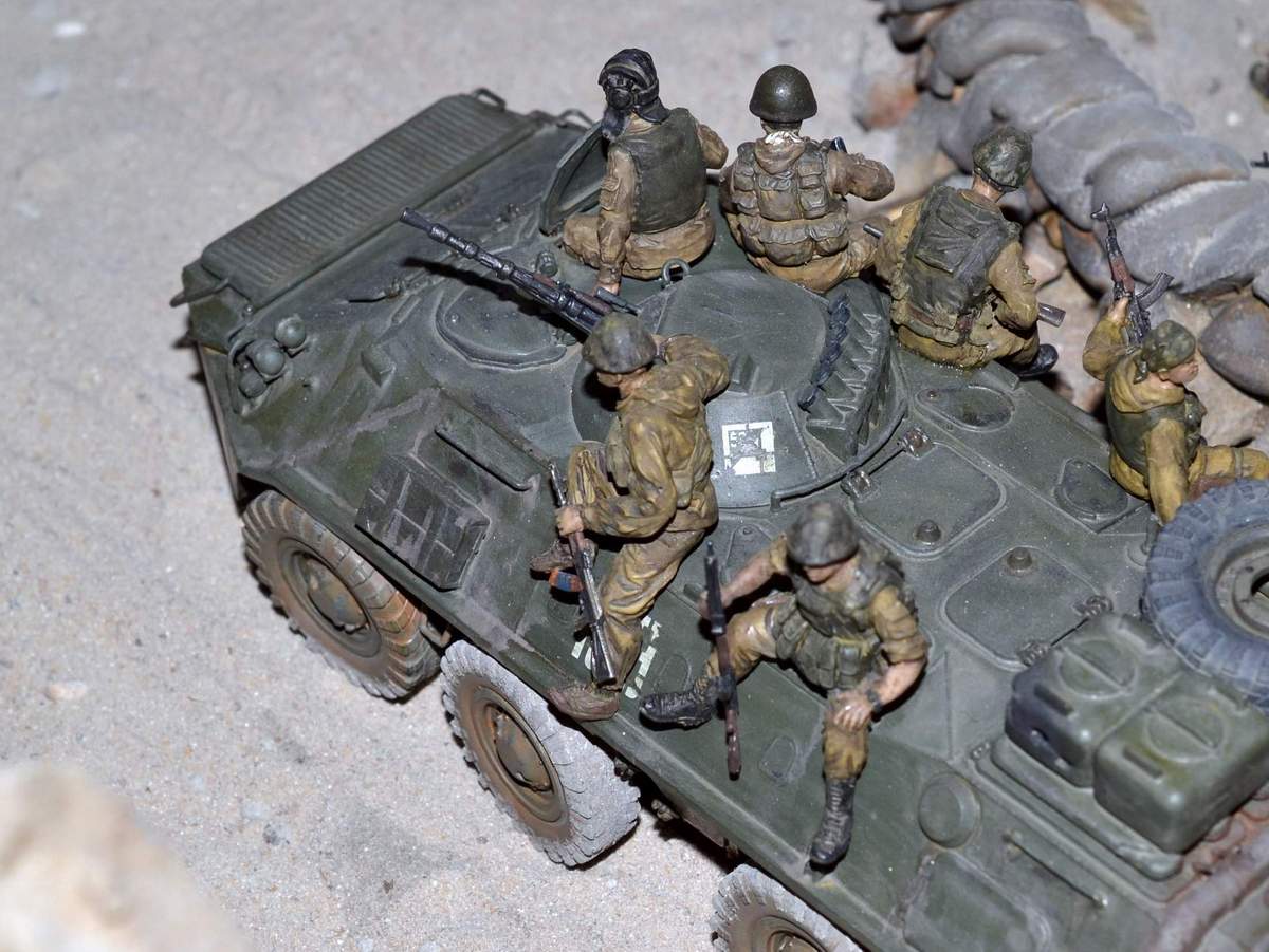 Её "игрушечность" не в простоте сборки, а в примитивной копийности. Точнее, в грубой некопийности. И как её ни крась, как ни натирай пигментами, так и остаётся детской игрушкой. Чтобы она стала похожа на настоящий БТР-70, её очень основательно перепиливать надо. И как, минимум, менять колёса.