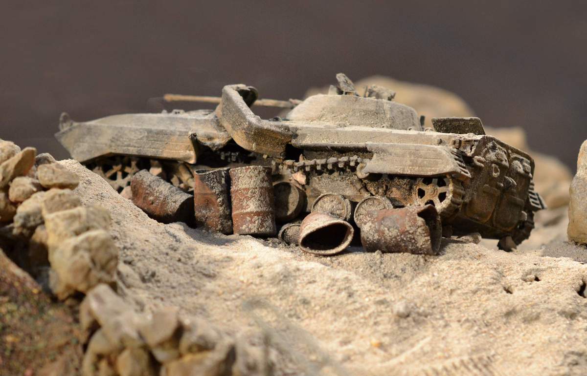 ученик, БМП завалили, а на ней даже гусянка от взрыва не слетела? Не верю. И по окраске - отбили бы её, например, копотью местами и ржавчиной. Горела всё-таки машина. И потом стояла, как вы пишите, не один год. Металл окислился ещё во время горения