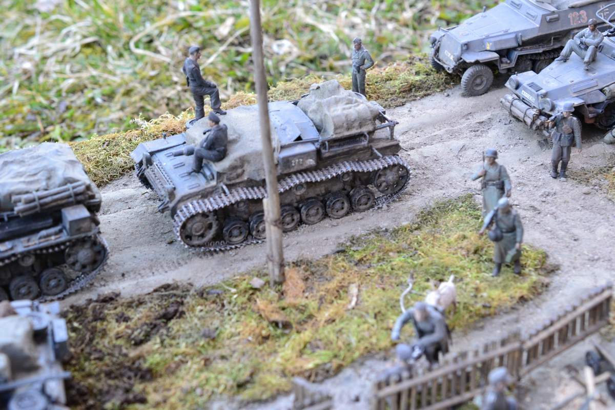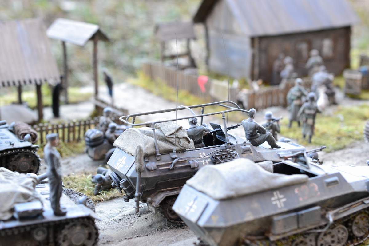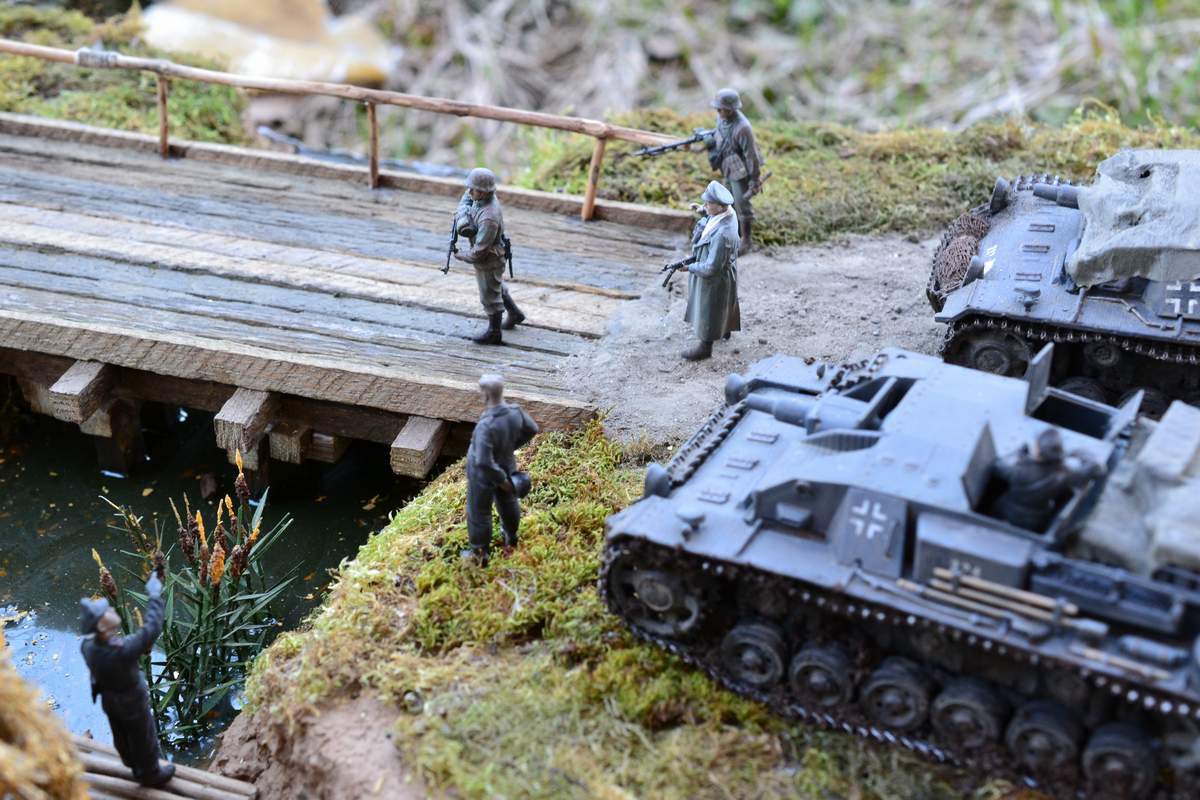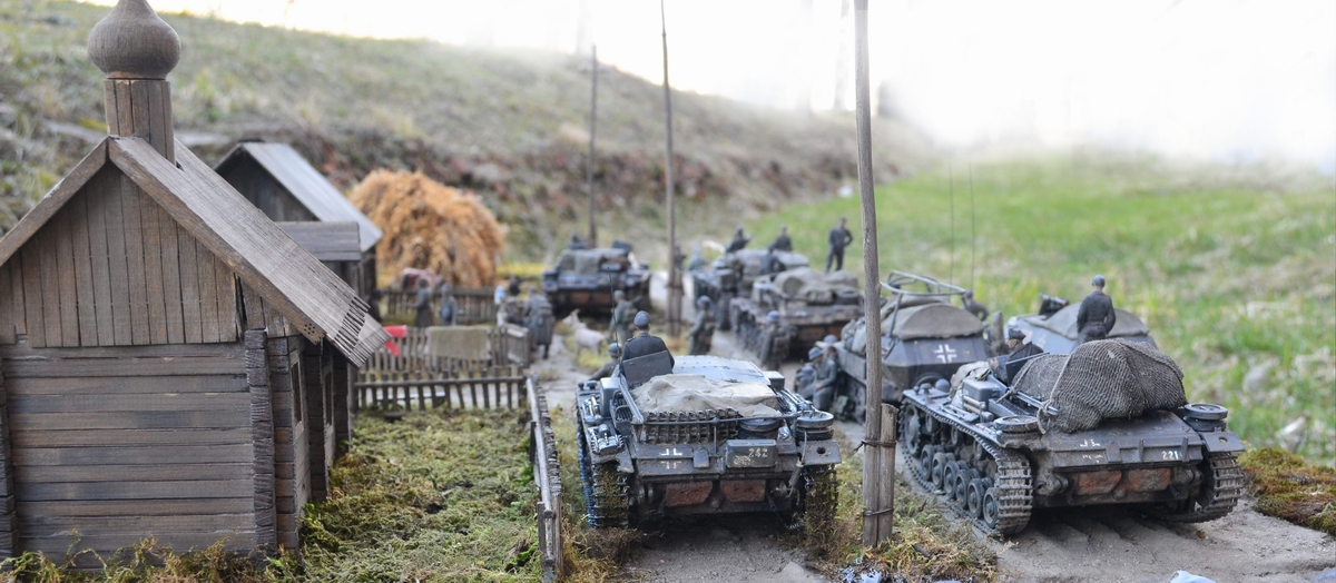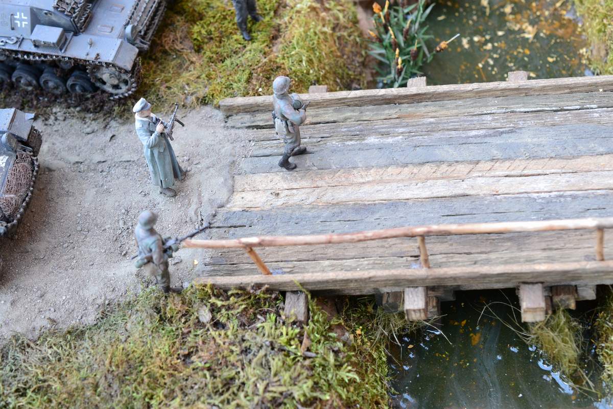 Масштаб 1/35. При построении использовал модели и фигуры Zvezda, Dragon, MB, Tank, Бастион 35, Mini Art . Красил красками TAMIA,тонировки MIG и самодельные на основе масляных красок. Основание диорамы монтажная пена, растительность натуральный мох.