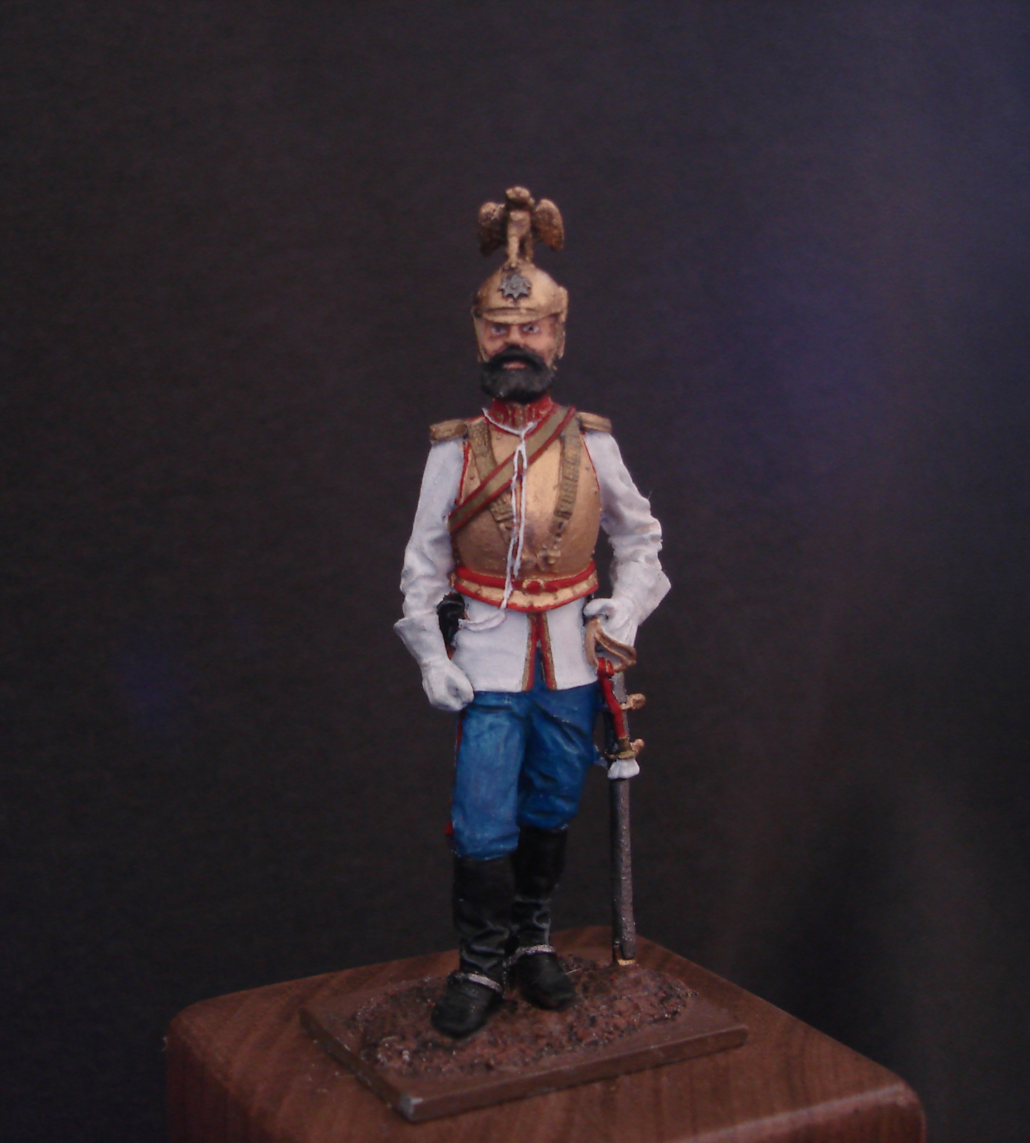 Оловянная фигурка 54 мм от фирмы «EK Castings». Фигурка является офицер Лейб-гвардии Конного полка. Россия, 1883-1914 гг. В росписе использовался акрил и металики. Матовый лак я ещё не нанес. Буду рад выслушать ваши советы и мнения.