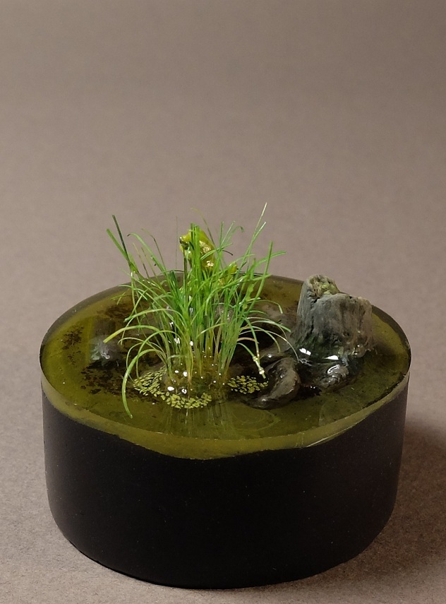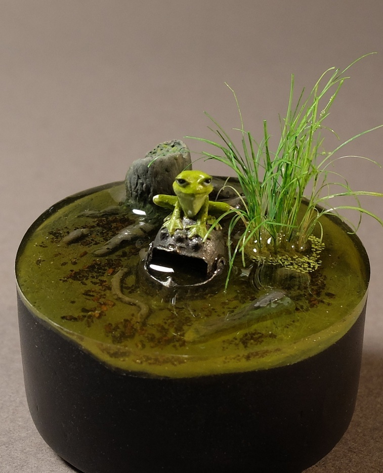 В основе смоляная фигурка лягушки на шлеме от Maow Miniatures. Дно и пень - самодел из двухкомпонентной шпатлевки. Растительность - щетина из какой-то простенькой малярной кисти. Диаметр основания 40 мм. "Вода" эпоксидная, вышла не очень удачно, но на мой взгляд приемлемо.