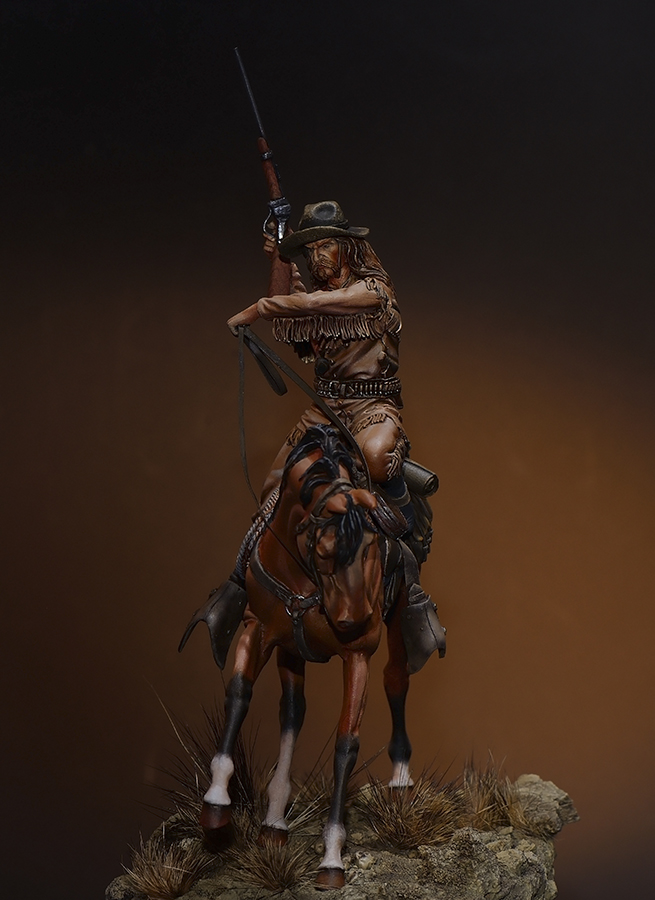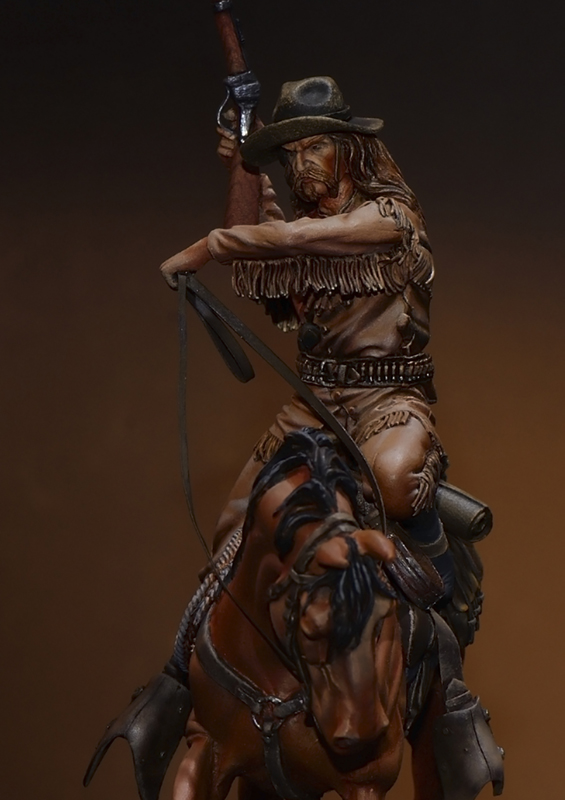Я думал это ни кто иной, как Баффало Билл, он же Уильям Коуди. Знаменитый охотник на бизонов, создавший в последствии цирковое шоу "Дикий Запад". На мой взгляд имеется портретное сходство. Позы во время охоты на бизонов могли приниматься самые разные. Смотрели "Танцующий с волками"? Там сцена такой охоты отлично показана. Например в тесноте и давке лошадь могла бежать вплотную с бизоном и всадник, чтобы не повредить ногу вполне мог подтянуть ее к седлу.
