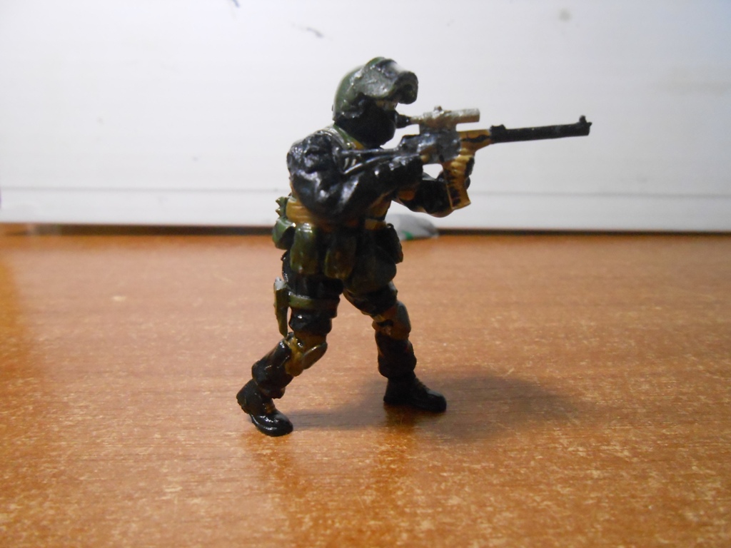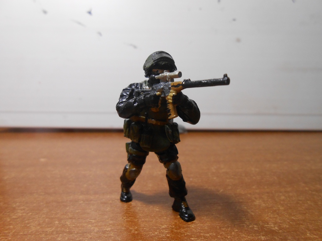 4. С черным цветом очень сложно работать, попробуйте для начала "одевать" бойцов в оливу. Если все-таки решите пробовать черную униформу, то не окрашивайте в базовый черный. Смешайте черный и светло-серый, например. Черным можно будет показывать тени в складках.