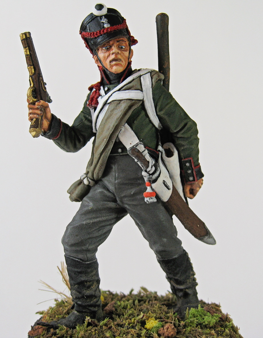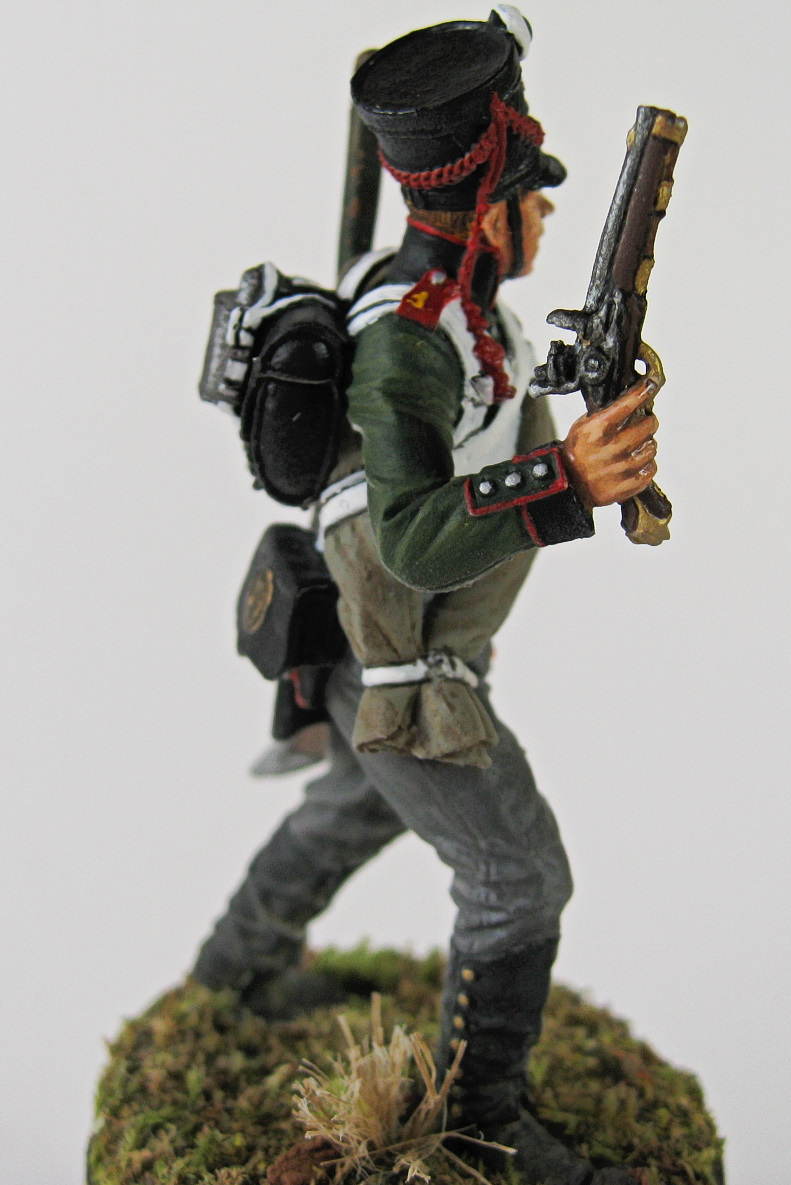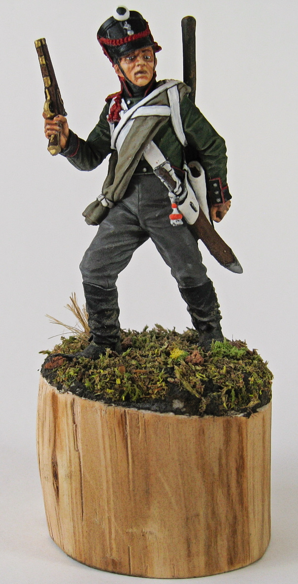 Миниатюра изображает пионера 3-й пионерной роты, 1-о пионерного полка на период 1809-11 годов. Кампанию 1812, а также часть кампании 1813 годов, полк провел в этой же униформе. Относительно оранжевого (или огненного) цвета темляка - есть такое мнение в исторической среде. На некоторых точно датированных родных вещах, скорее оранжевый, нежели желтый. Поначалу, хотел сделать второй полк, однако отринул данную идею вследствие сложностей с рисованием цифры 2 на погоне (пистоль мешал, а мучится не хотелось).