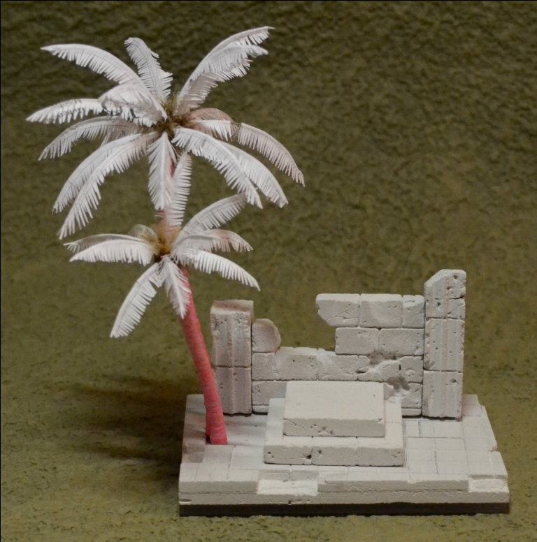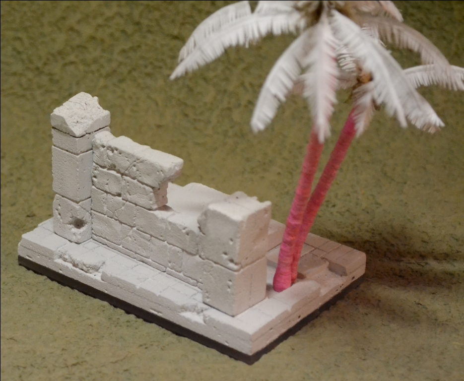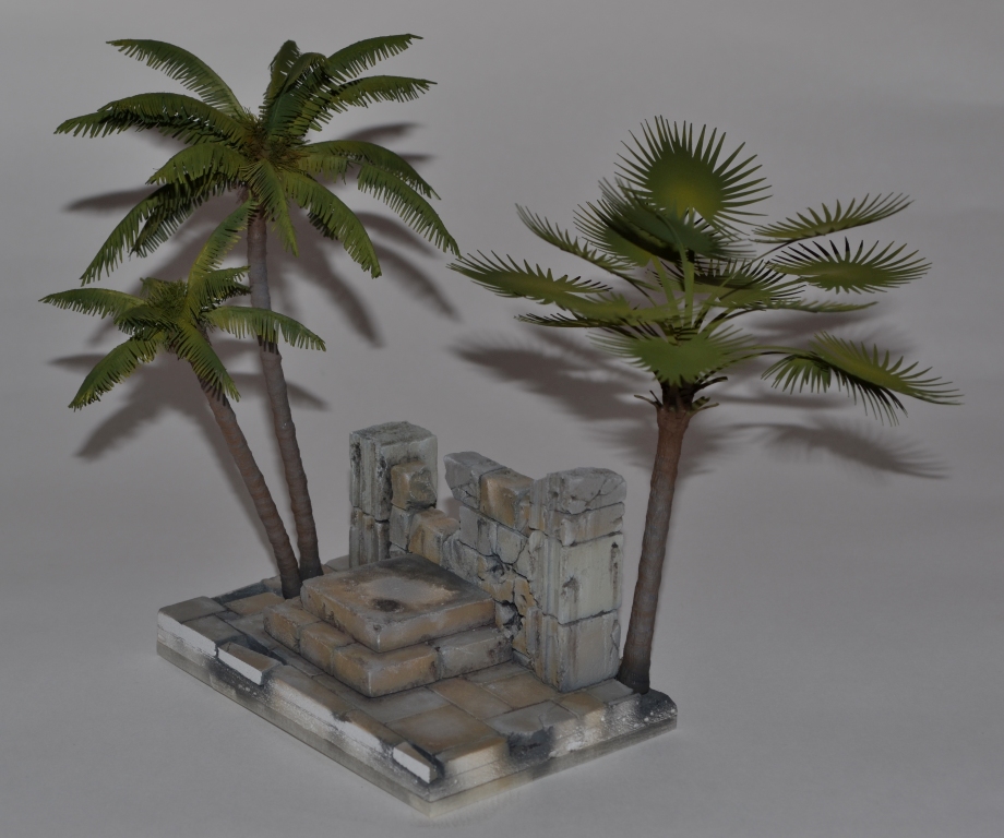 Фото о дальнейшей проделанной работе. Все каменное окрашивалось аэрографом, расписывалось темперными красками и финишно доводилось пигментами разных производителей. Пальмы ожили после такой же проведенной над ними работы. Осталась только тонировка. Работаю дальше...