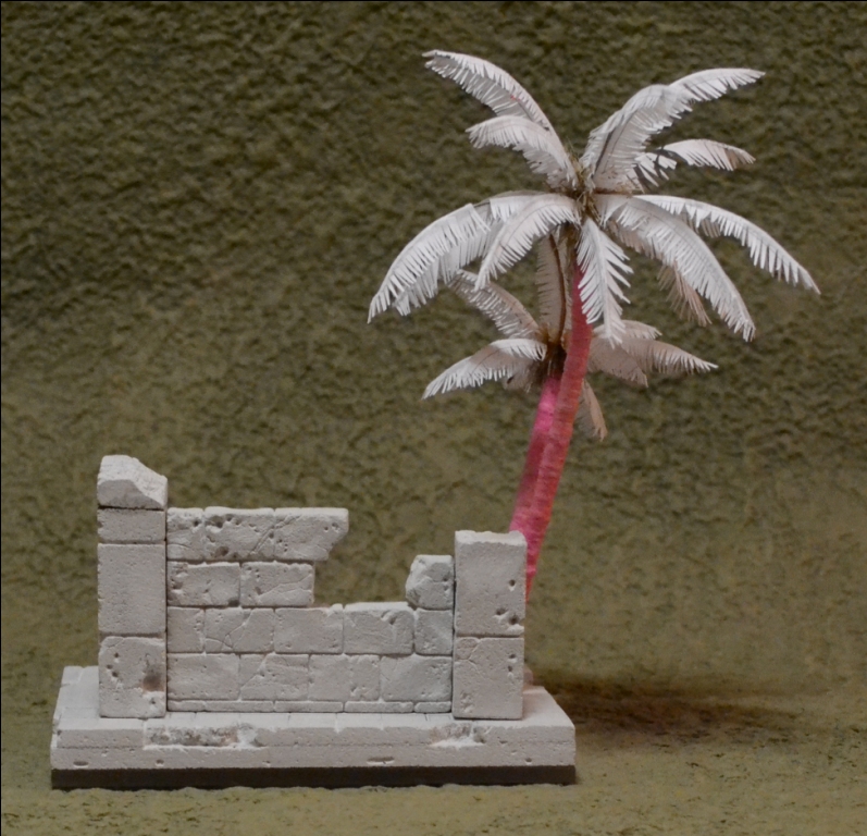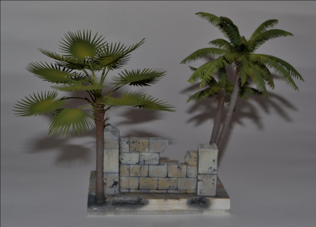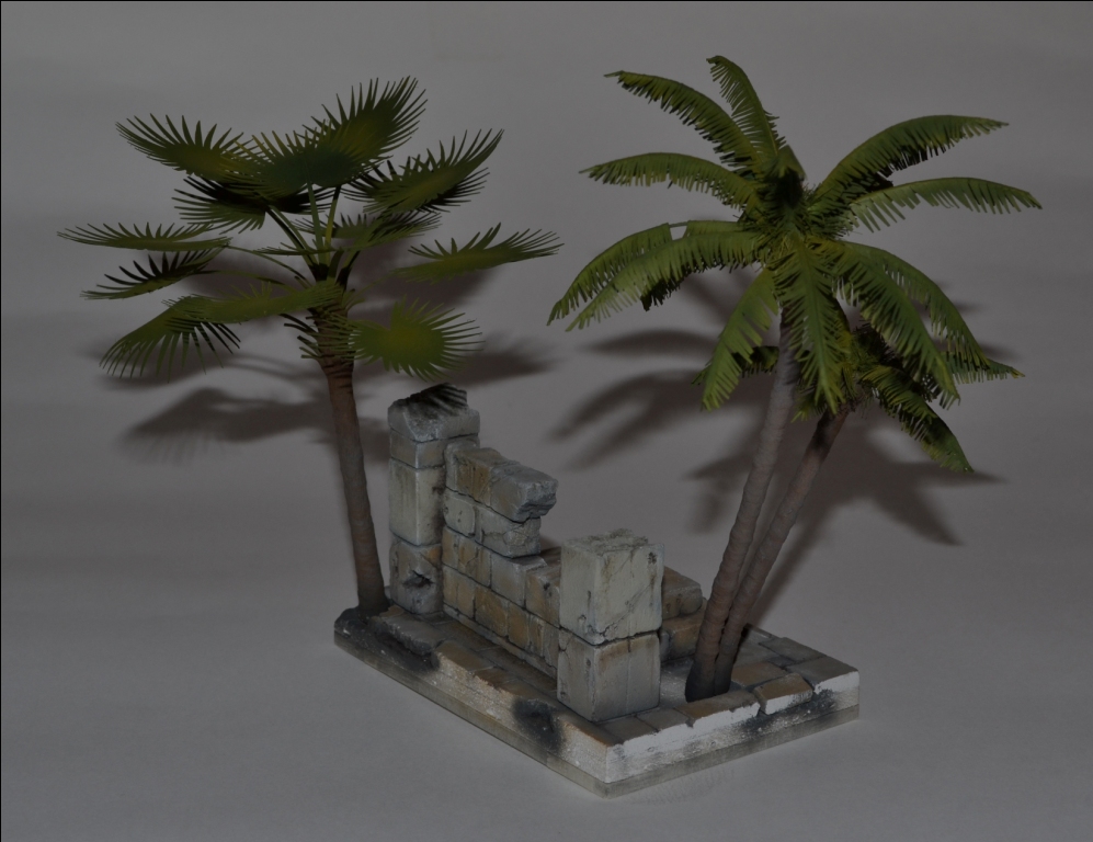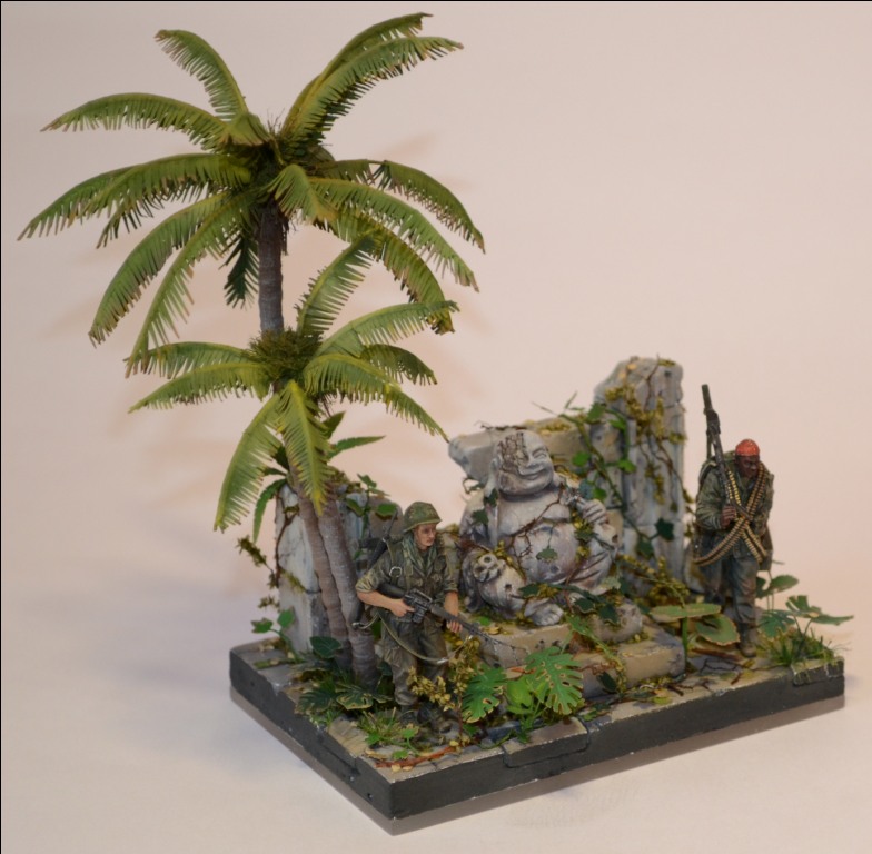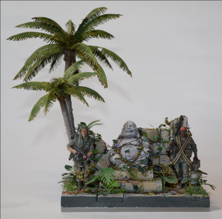 Приветствую всех! Хочу поделиться началом своей работы над диорамой 1/35. В композиции будут использованы фигурки "BRAVO 6", оружие "TANK", пулеметные ленты"ZEBRANO", фигурка Будды. Все остальное делалось самостоятельно. Элементы основания храма и разрушенной стены отлиты из гипса отдельно друг от друга и доработаны различными инструментами до реалистичности. Стволы пальм сделаны из алюминиевого провода и обмотаны пергаментной бумагой. Листья пальм и другой растительности нарисованы разных размеров в векторной графике на компьютере и вырезаны на плотере. Фото о дальнейшей проделанной работе и окончательного варианта диорамы постараюсь выложить в скором времени.