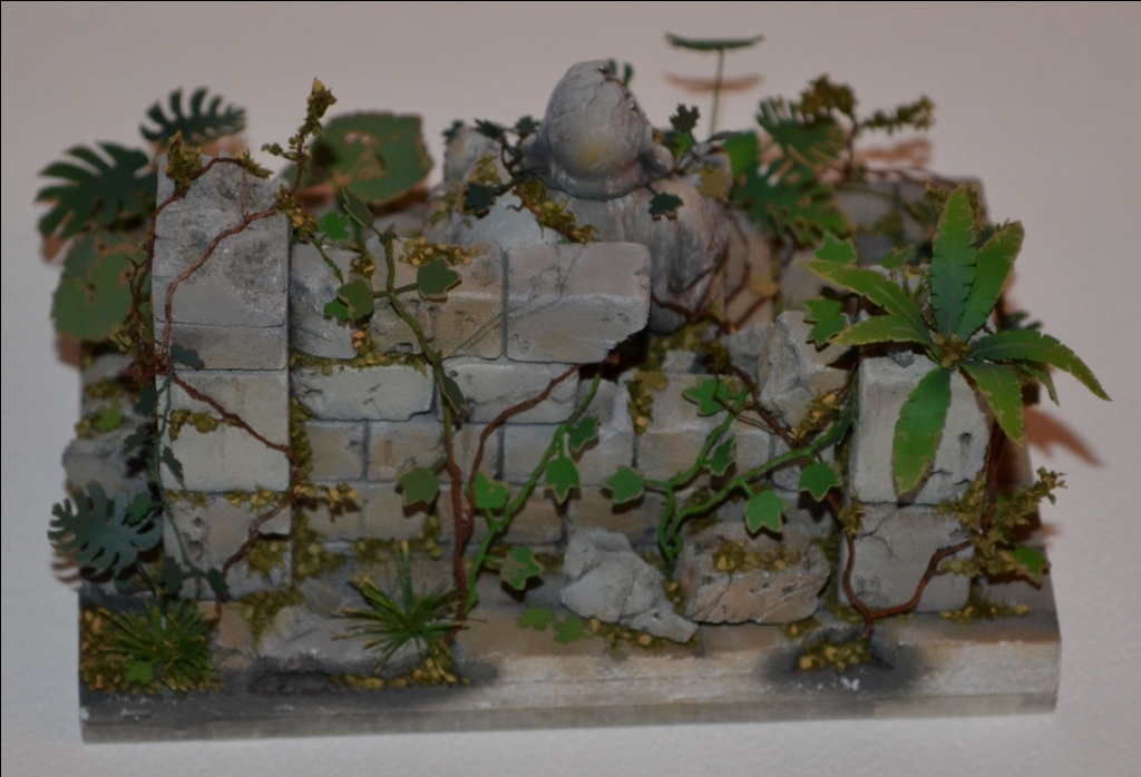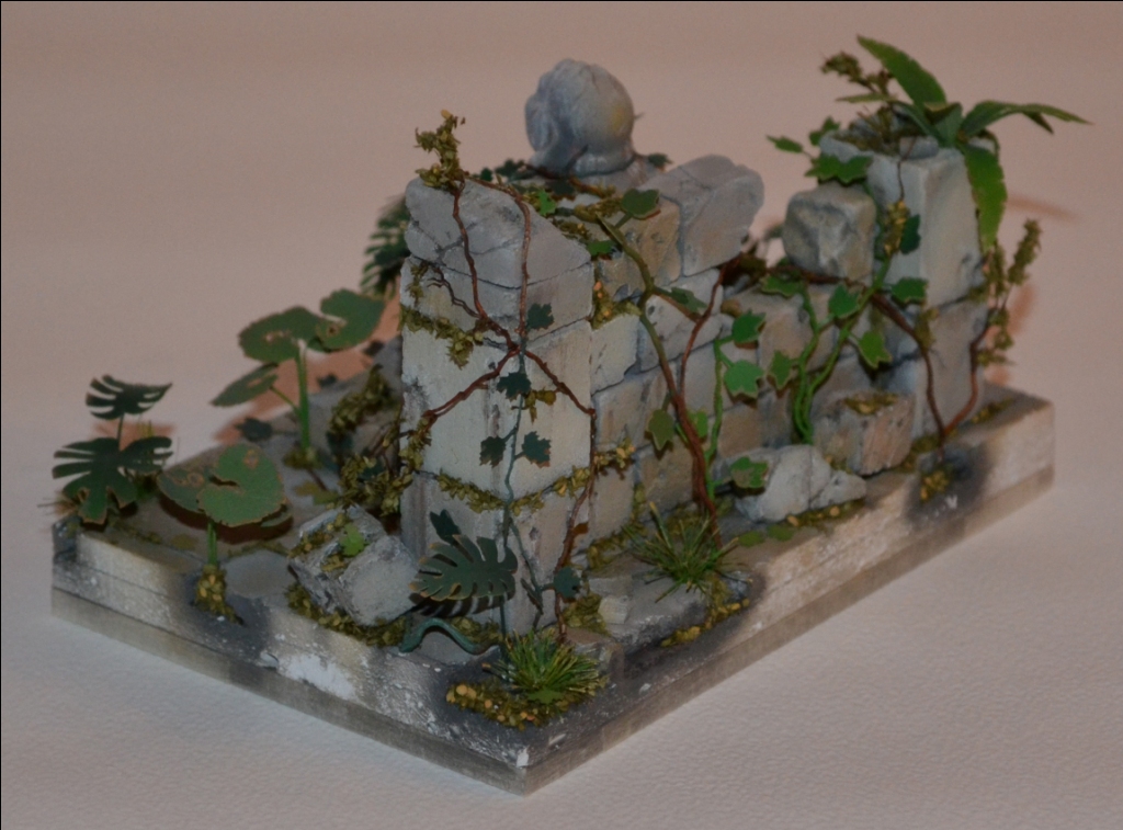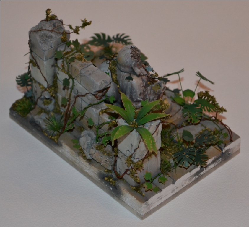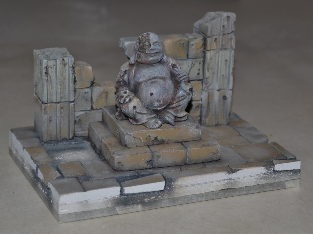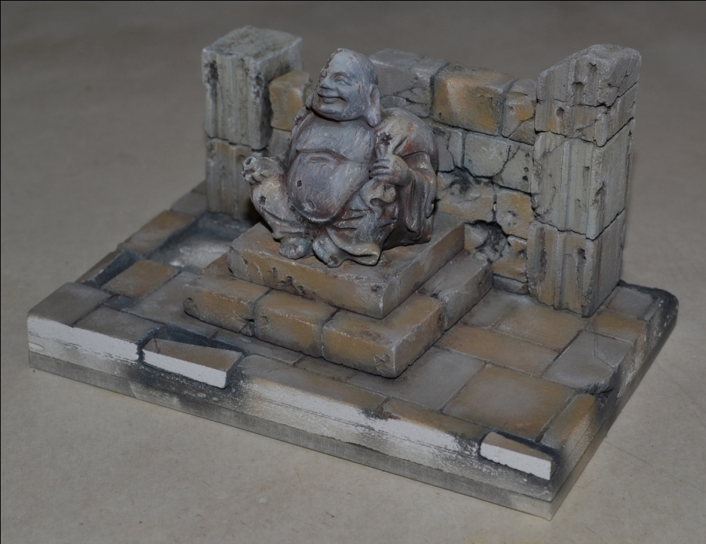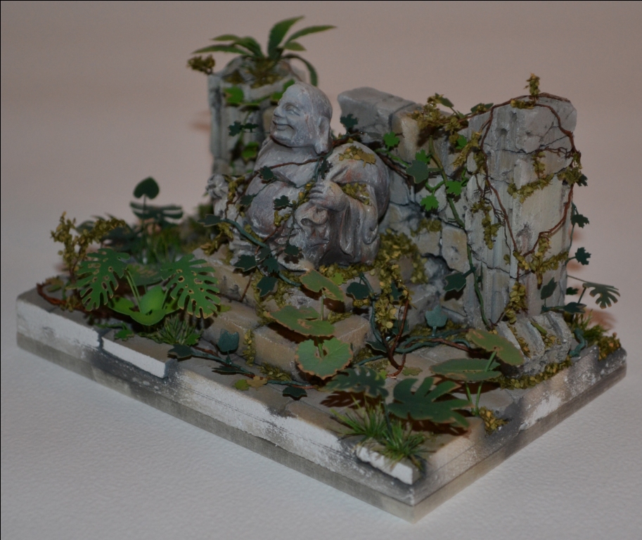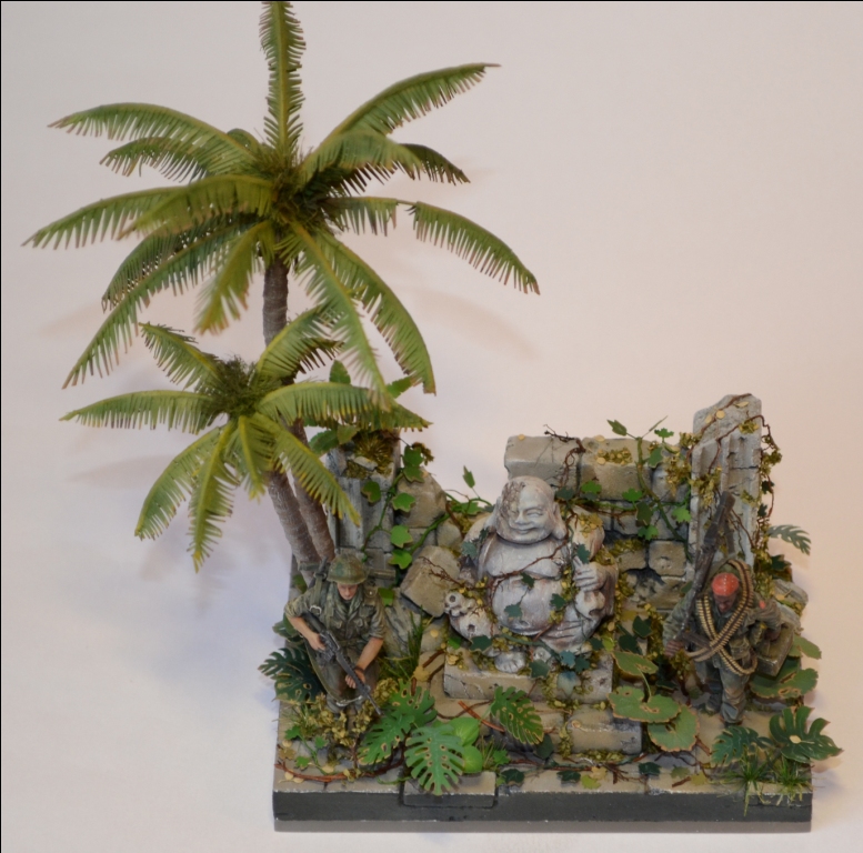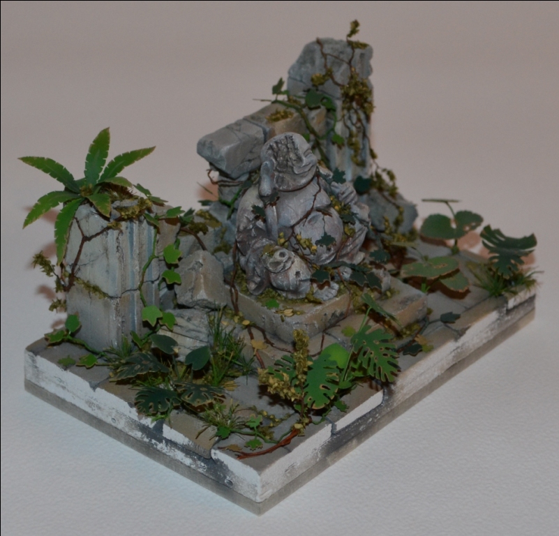...пальмы не отменяются, в доработке. Потеки на камнях и на Будде присутствуют от дождя, грязи и т.д. Травянистая растительность тоже есть. Если добавить еще и зелени на каменистые поверхности, то все сольется! А мне этого не надо. А тропический мусор появится в самом конце после установки пальм и фигурок.