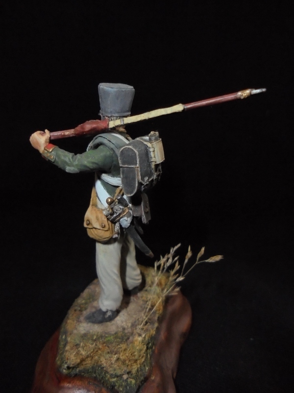 Добрый день!Погон поправил,закрасил.Шинель вы имеете ввиду скатка?Ориентировался на картинку фирмы:Здесь сами видите цвета разные.Если в скатке шинель(что по скульптуре непохоже),то красить нужно в крапинку.Но я еще заглядывал на вот эту работу:http://www.diorama.ru/gallery/dioramas/5884/С уважением!