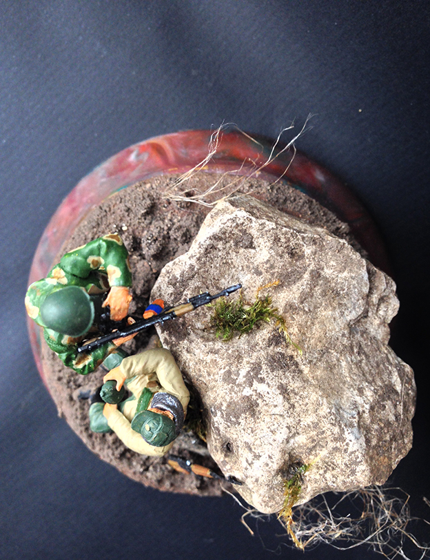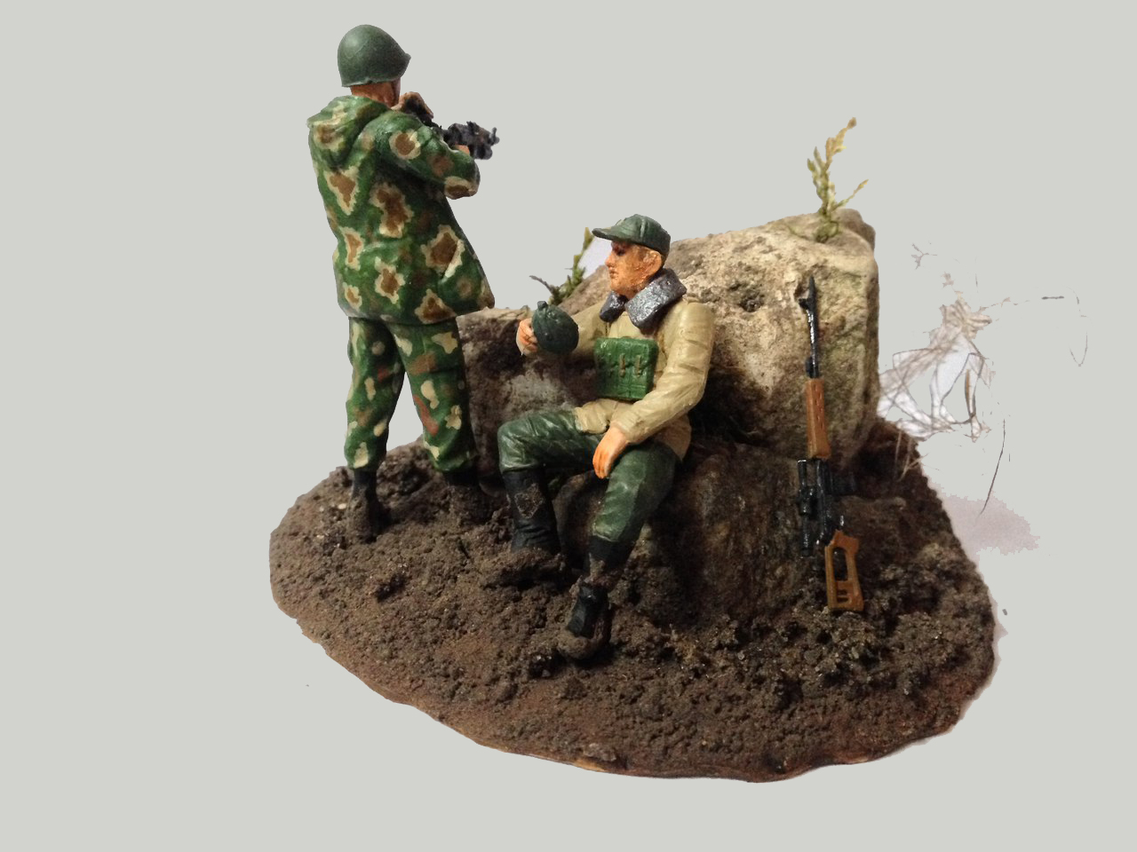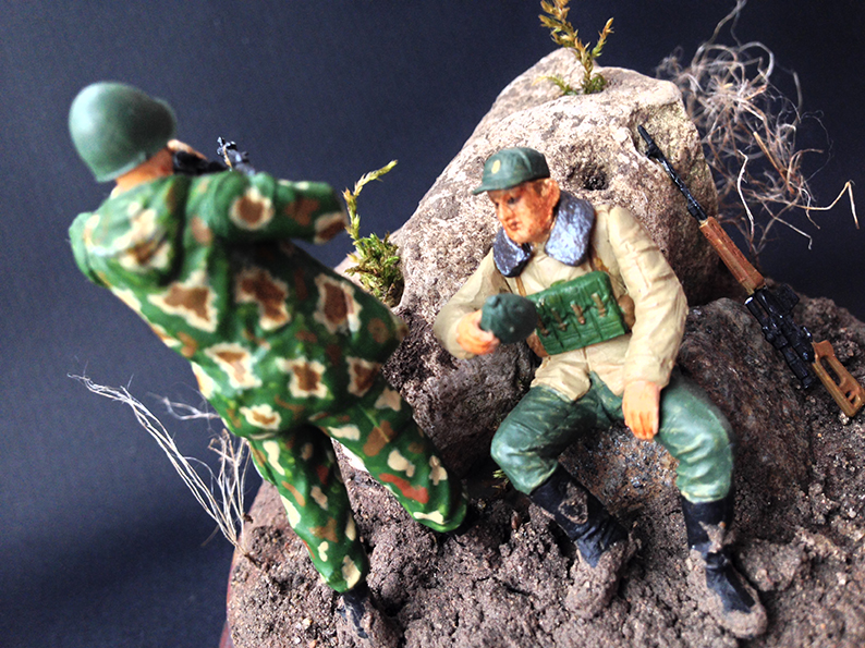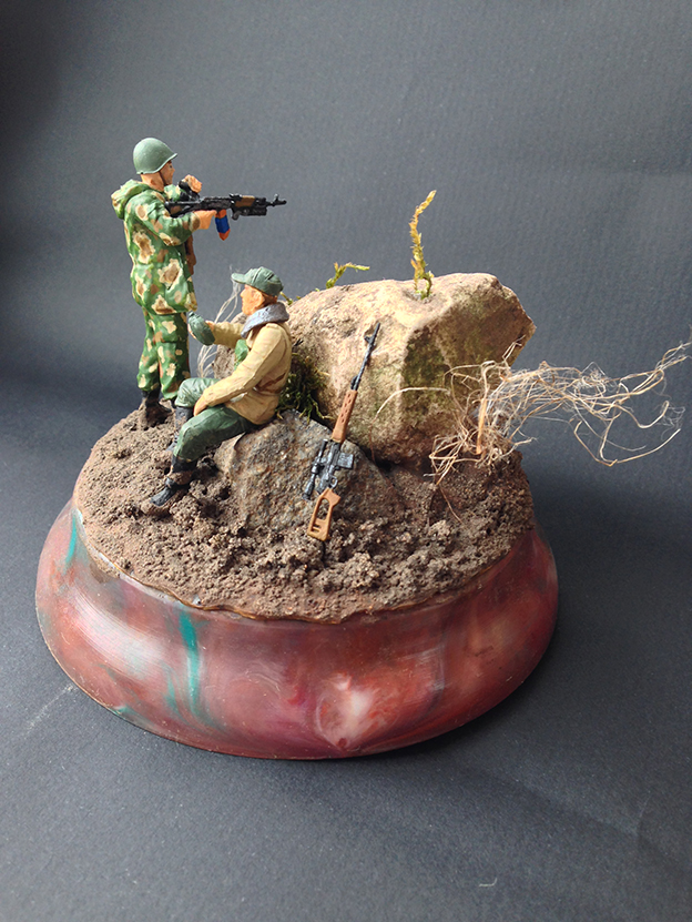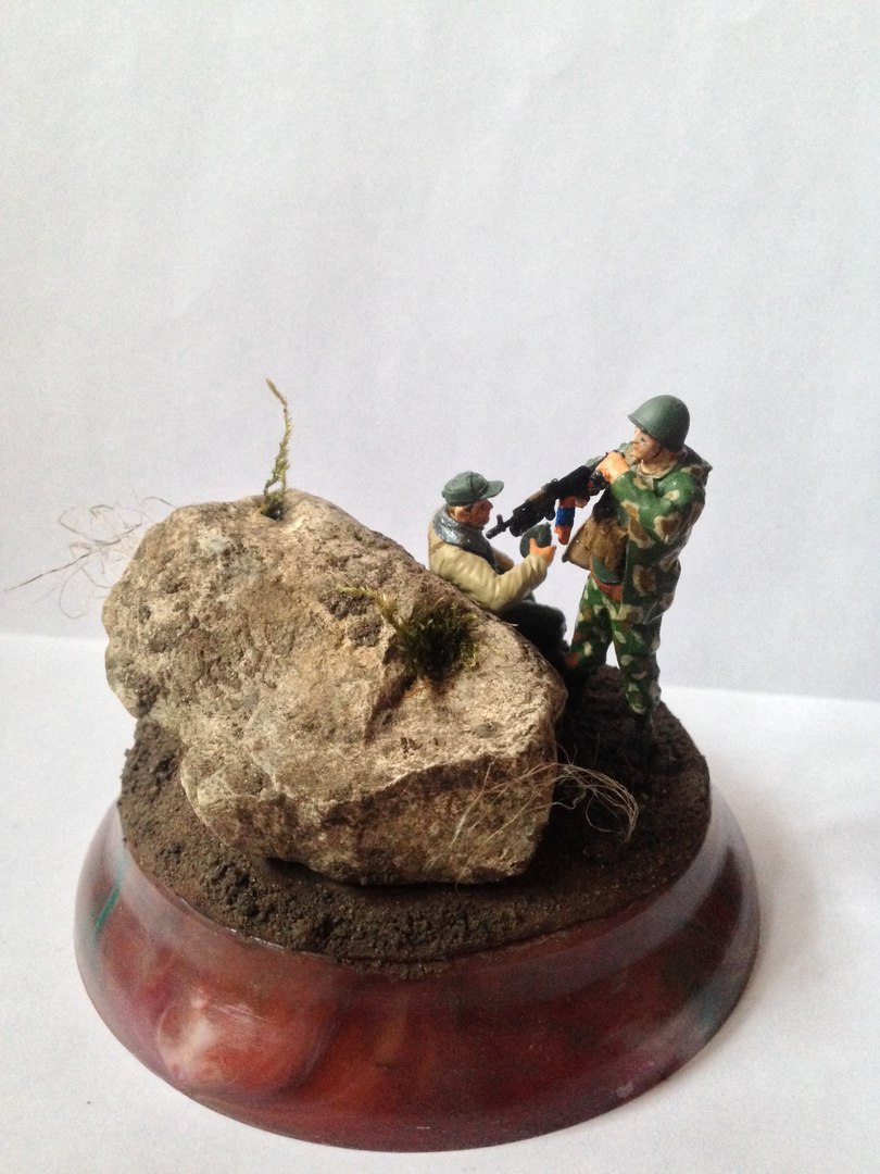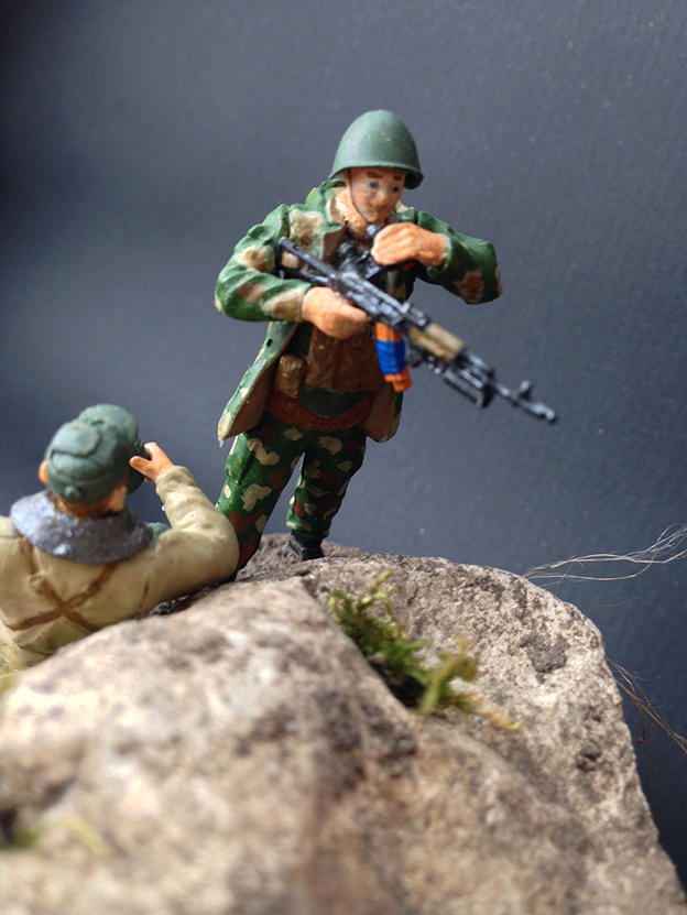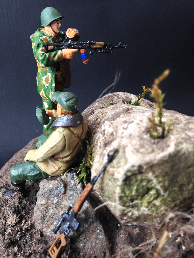 Доброго времени суток, дорогие друзья! Наконец, мне удалось попасть в Ваши ряды. Я хотел бы поделиться с Вами своей первой работой и узнать Ваши мнения и предложения для улучшения моего дальнейшего творчества. Идея создания своей собственной виньетки пришла ко мне после просмотра сайта Diorama.ru. Я был удивлён, какое волшебство творят моделисты со своими работами и мне захотелось попробовать воплотить в жизнь что-то подобное. И так, перейду к рассказу о своей работе: в композиции было использовано несколько наборов от фирмы Звезда, окрашивал акриловой краской Звезда, в первый раз делал земляное основание для виньетки. Настоящим испытанием для меня была роспись лиц солдатиков, прошу не судить строго, старался, как мог. Спасибо за внимание! Постараюсь ответить на все Ваши вопросы.