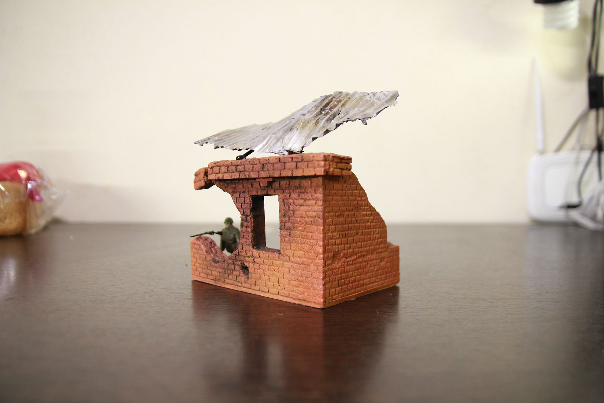Кирпичи вырезал из пластика, покрасил их в цвет кладки и засыпал сажей.