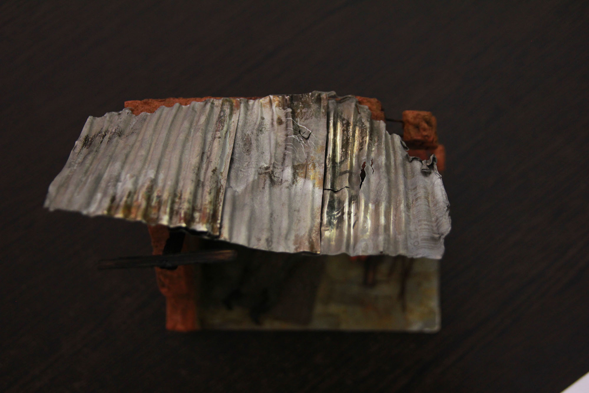 Для создания формы для прокатки крыши взял палочки от чупа-чупсов, разрезал их пополам, приклеил к пластику в 6 рядов и целой палочкой прокатал пластинку предварительно накгрев горелкой до красна. При прокатке появились естественные увечья кровли. а горелка дополнительно разрушила края.