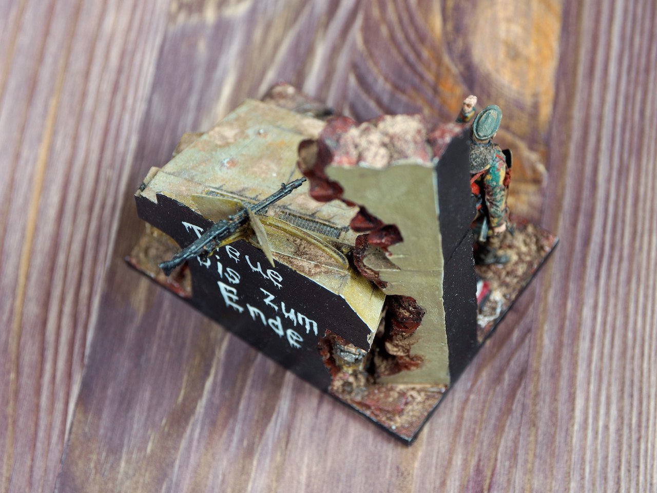 В работе использованы фигура от Mantis Miniatures и основание от Darius Miniatures. Колючая проволока, флаг, плакат и остальная мелочь из запасов. Все окрашивалось красками Vallejo, AK-47, Revell и Tamiya, а так же были использованы разнообразные пигменты MIG.