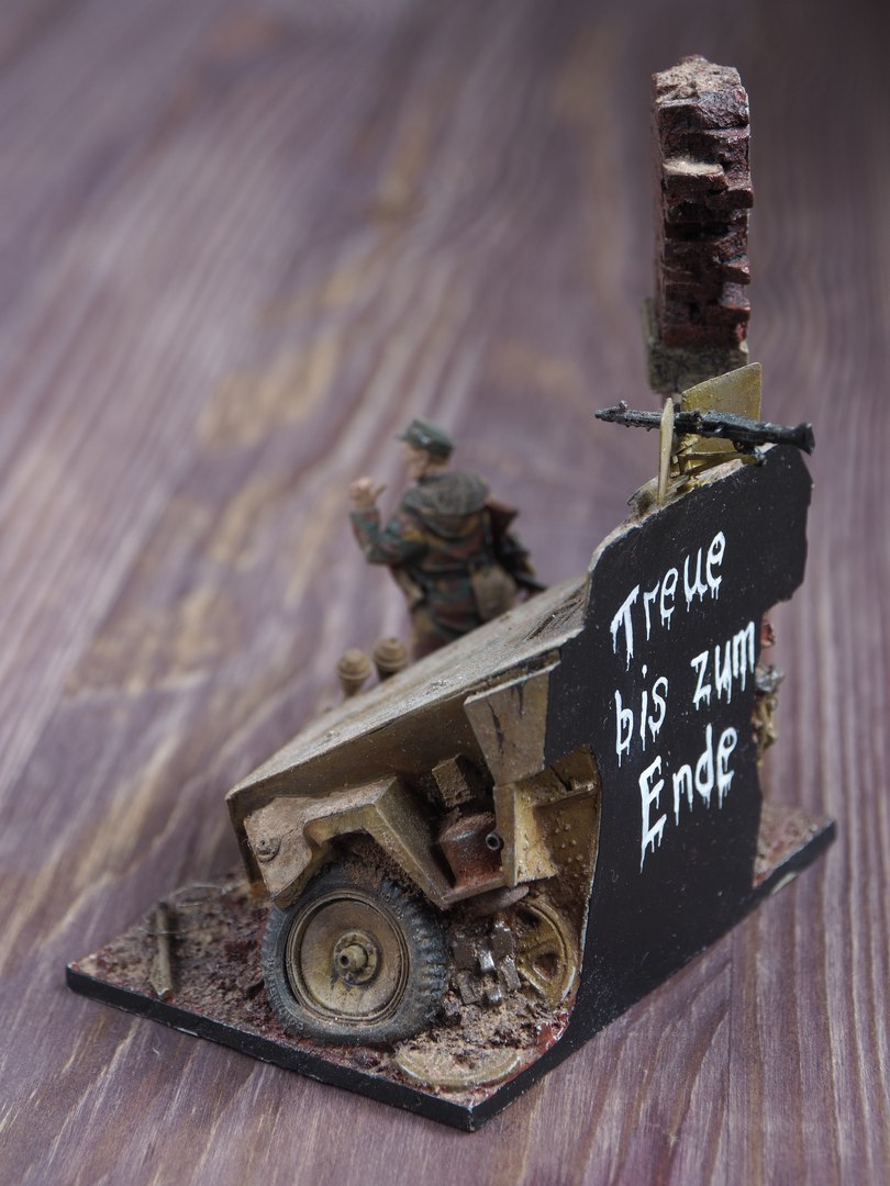 Представляю Вашему вниманию свою работу "Верные до конца", масштаб 1/35. Померания, март 1945 года. Солдат из 11-й дивизии СС "Nordlad", стоящий рядом с подбитым несколько дней назад бронетранспортером из своей же дивизии, разговаривает с кем-то из товарищей о близости конца и о том, что с ними со всеми будет в ближайшие дни.