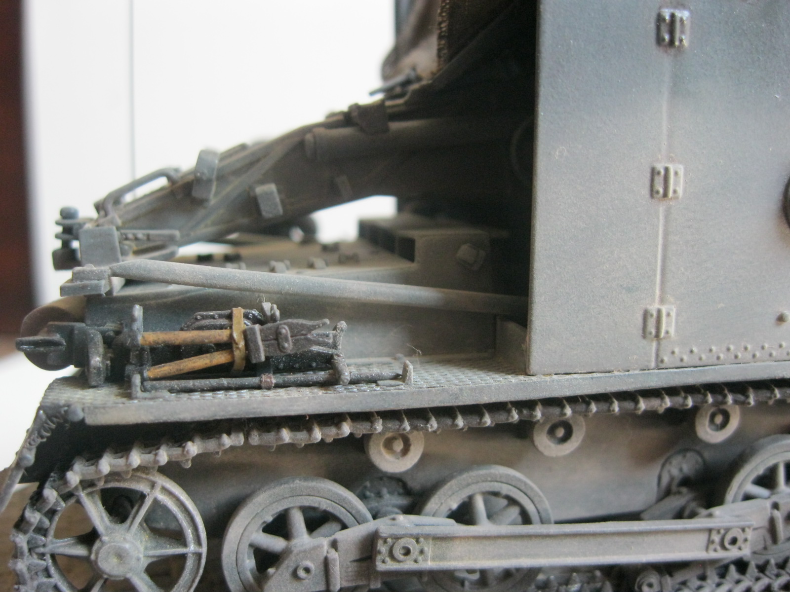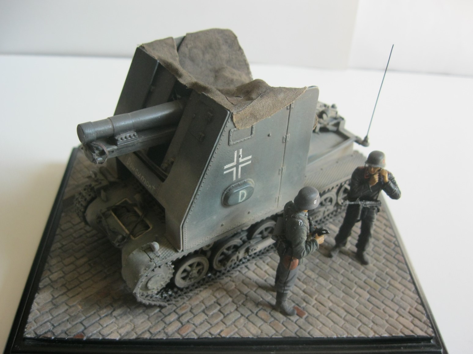 Всем Доброго времени суток! На просторах интернета наткнулся на интересную фотографию этой самоходки,воевавшей во Франции. Модель досталась мне наполовину готовая. Некоторые детали были утеряны,а некоторые пребывали в ужасном состоянии. Заново сделан щит и ствол гаубицы, пружинки для задних подкрылок самоходки, заменены поддерживающие катки (у всех катков из набора было смещено отверстие для приклеивания на модель),добавил самодельный трос,брезент-парусина,вырезал трансмиссионный люк. Ствол гаубицы-точеный на станке самостоятельно,заглушка-из тонкого полистирола.