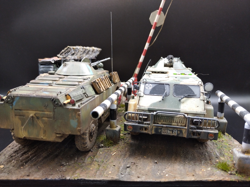 Давным давно хотел сделать что-нибудь из темы на вторую чеченскую, в коей довелось поучаствовать командировками в ЧР. Сначала была мысль сделать ПВД в Гудере по своим фото с "Бардаком" (БРДМ),потом зашла тема с "Водником" ( бронеавтомобиль) в Ханкале. И в один прекрасный момент решил обе темы объединить в одну с композицией блокпоста,коими были утыканы все дороги тогдашней Чечни. Собственно, так и возник этот "Райский уголок" где-то в районе Герзельского моста. Жизнь на блокпостах кипела полным ходом, дневной зной менялся ночным диким холодом, обстрелы,провокации,досуг: кто во что горазд...ну и конечно, работа,работа... Проезжавший мимо "чудоавтомобиль" или как говорят,"коробочка", вызвал неподдельный интерес у обитателей поста.