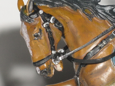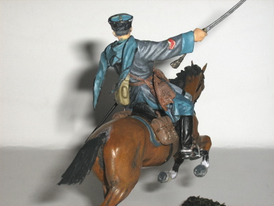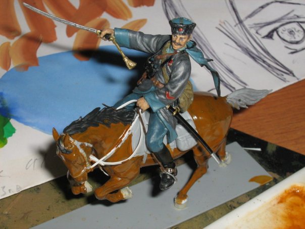 Действительно краски нужны матовые. Серый цвет черкески посветлее, а светло-синий (голубой) поярче. Темляк на шашке не должен быть позолоченный.