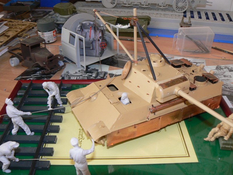 Суть диарамы такова: бригада ремонтников удаляет полседствия диверсии на ж/д путях. Железнодорожное полотно будет немного приподнято над общим уровнем диарамы, в виде насыпи. Полотно будет в половину ширины рамки, далее будет воронка над которой будут висеть покореженные взрывом рельсы. Сбоку будет подьезжать Пантера вызванная для помощи ремонтникам.. Пантера, потому что очень хотелось сделать двухтонный кран на башне, рельсы потому что понравилась фотография в какой то книге.. уж больно живописно они там были взорваны.. а чтоб хоть как то связать все придумал это название и занимаюсь подбором еще двух фигурок. Офицера распекающего посыльного, который не нашел ничего лучшего в качестве тягача, как пантеру.