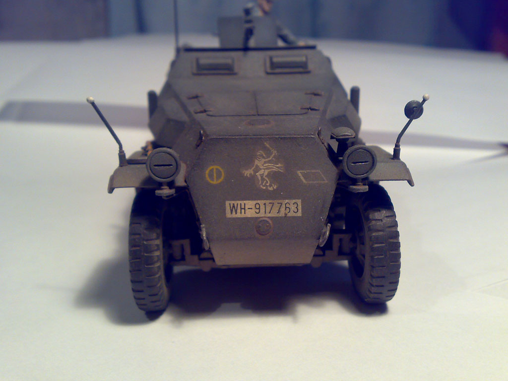 Собрал год назад. Можно считать что собрал из 2-х моделей (Tamiya и Звезда), т.к. гусеницы, ведущие колеса, кресла, полки, сидения, ружья и всякую другую мелочь взял с набора звезды. Первым делом, что мне не понравилось в тамииевском наборе – это клепаная версия машины, и долго не думая я срезал все заклепки. Самодельно доработал фары, пружины сидений на спинке, инструментальные ящики, шанцевый инструмент и проводку фар.