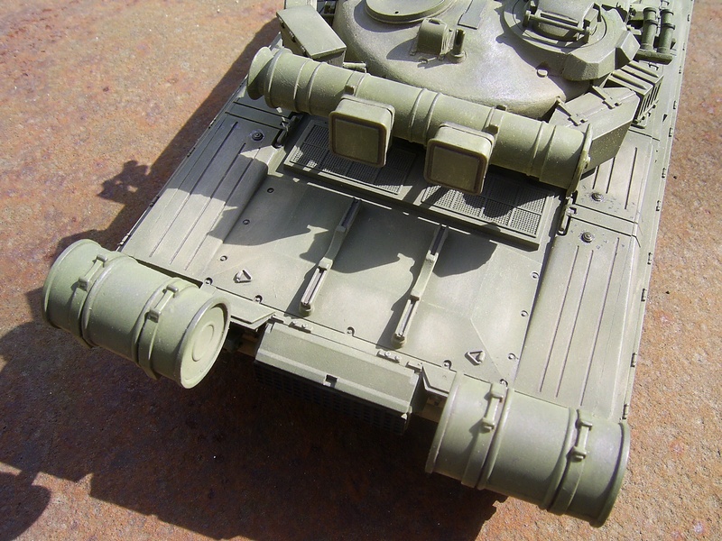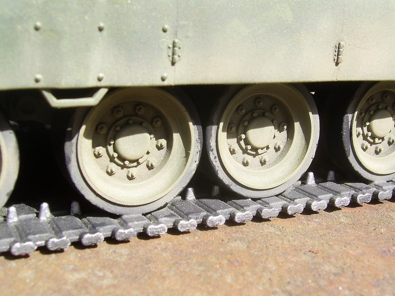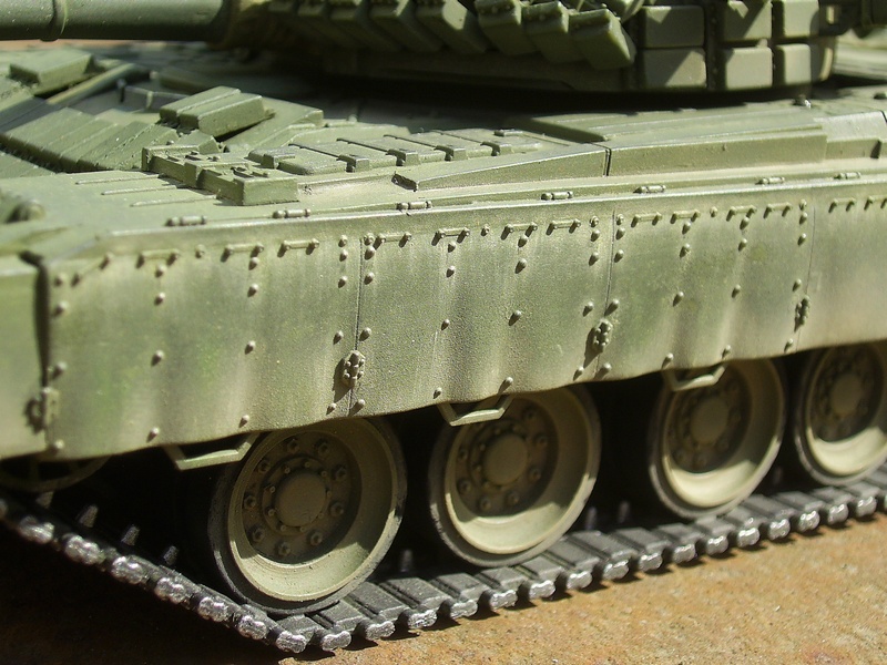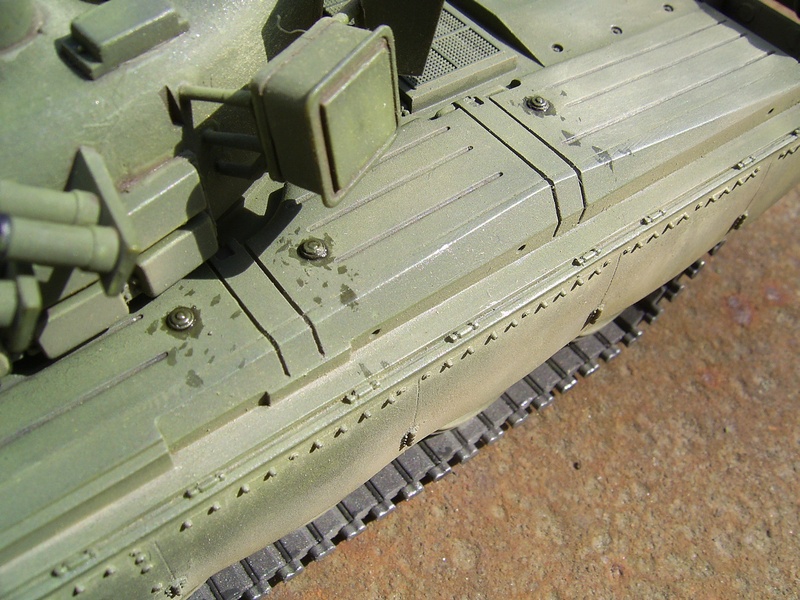 Красил аэрографом. Хотел сделать сильно запыленный танк. Добавил на экраны, заднюю часть башни и на корму немного хамброла "светлая земля" (аэрографом), а потом тамиевские пигменты наносил кистью: сначала наносил пигмент, а потом растирал его сухой кисточкой, чтобы оставался только вокруг головок болтов и в углублениях.